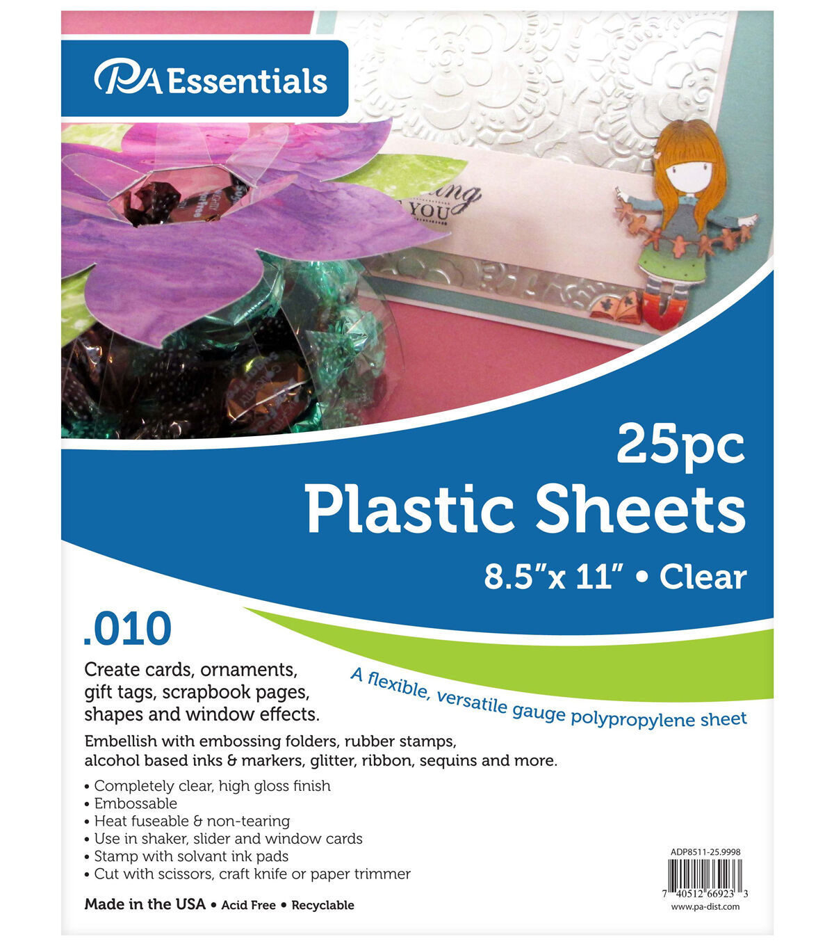 Paper Accents Acrylic and Plastic products for scrapbooking, albums, books, calendar pages, die cuts, home decorating projects, clockmaking and much more. Plastic Sheet 8.5"x 11" Clear .010" 25pc- .010" thick/ 10 mil, with removable protective sheets.
