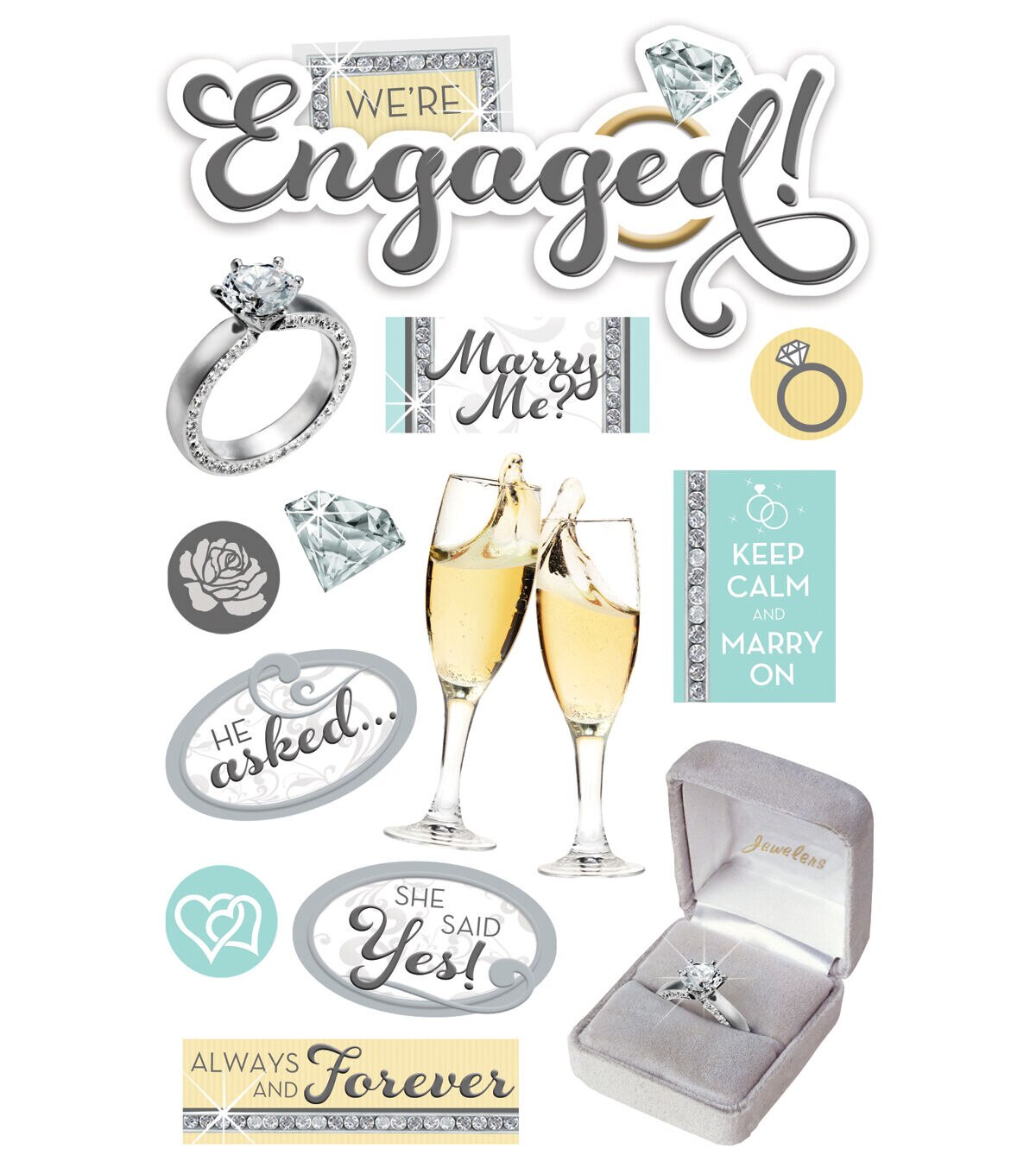 Designed with multiple layers, the Paper House 3D Stickers-Engaged will add dimension to all your craft projects. These 3D stickers are perfect to decorate your greeting cards, scrapbooks and photo albums. With photo-real imagery featuring engagement-themed images and sentiments, they'll enhance the look of your projects. They feature lovely embellishments like foil, glitter, ribbon, bling and more, and are acid and lignin free.