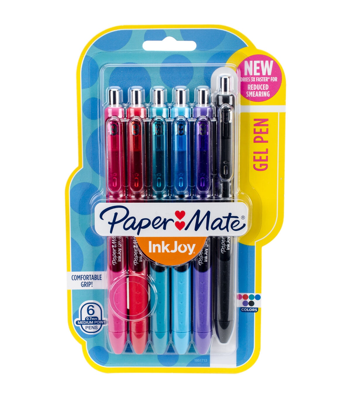 Paper Mate-InkJoy Gel Pens. Brighten up your writing with these quick-drying and smear-free gel pens! This package contains six 5-3/4 inch long 0.7mm gel pens in assorted colors. Imported.