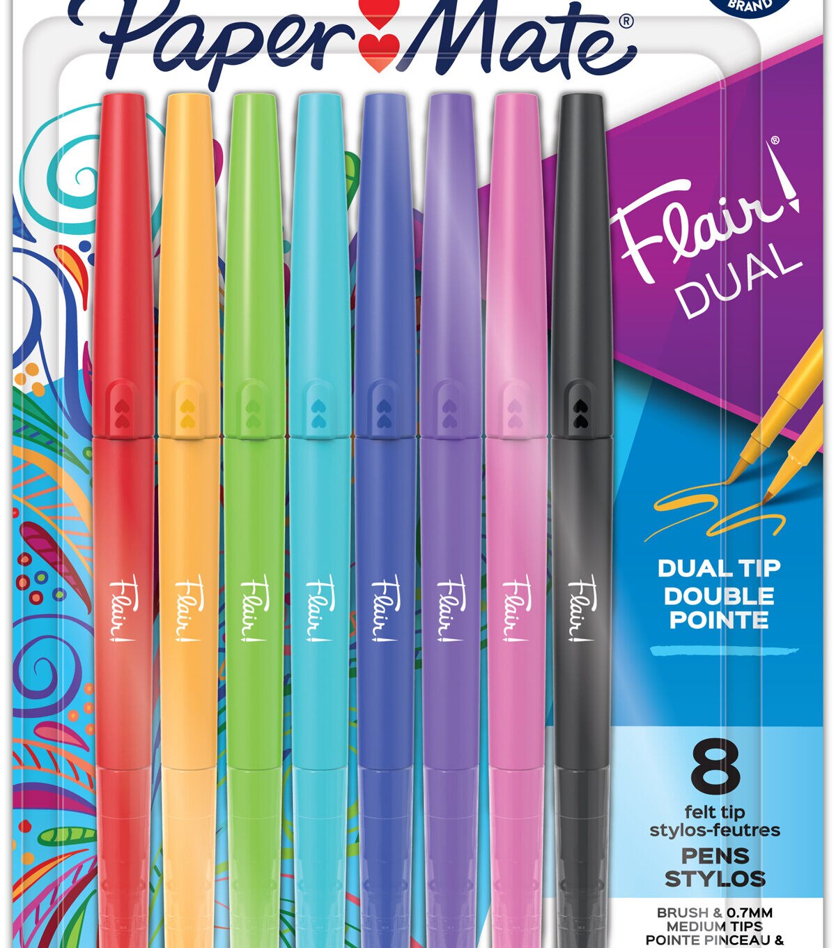Double your creativity with Paper Mate Flair DUAL! These vivid Flair pens are dual-ended, with a flexible brush tip on one end and a medium (0.7mm) tip on the other, making them perfect for hand lettering, note-taking, journaling, and more!