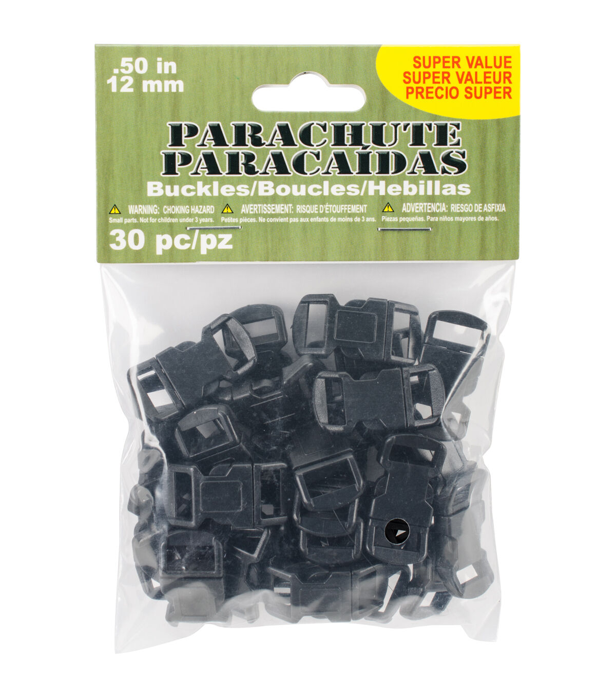 Pepperell-Parachute Cord Buckles. Each of these plastic buckles has two individual pieces that clip together to form one piece. Simply pinch the edges to open and separate. This package contains thirty 12mm wide cord buckles. Imported.