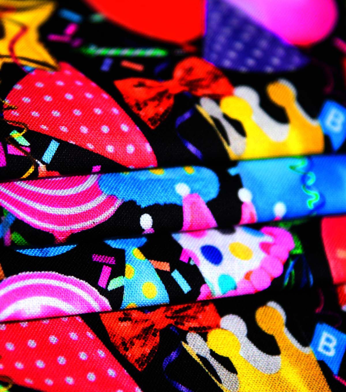 Bring the party to your next sewing project with Party Time on Black Novelty Cotton Fabric. This fun and festive fabric features a black background with colorful confetti and streamers, perfect for any celebration. Whether you're creating decorations, apparel, or accessories, this fabric is sure to add a touch of fun to your project.