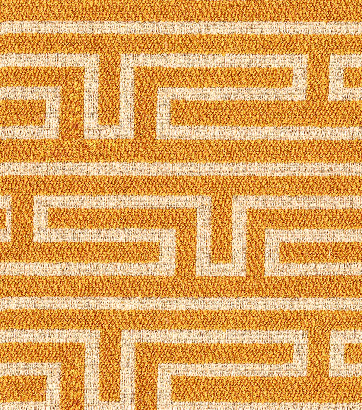 Pathway Mustard Geometric Jacquard Fabric features a geometric design in a graphic maze formation, shown in this soft yellow that adds depth.