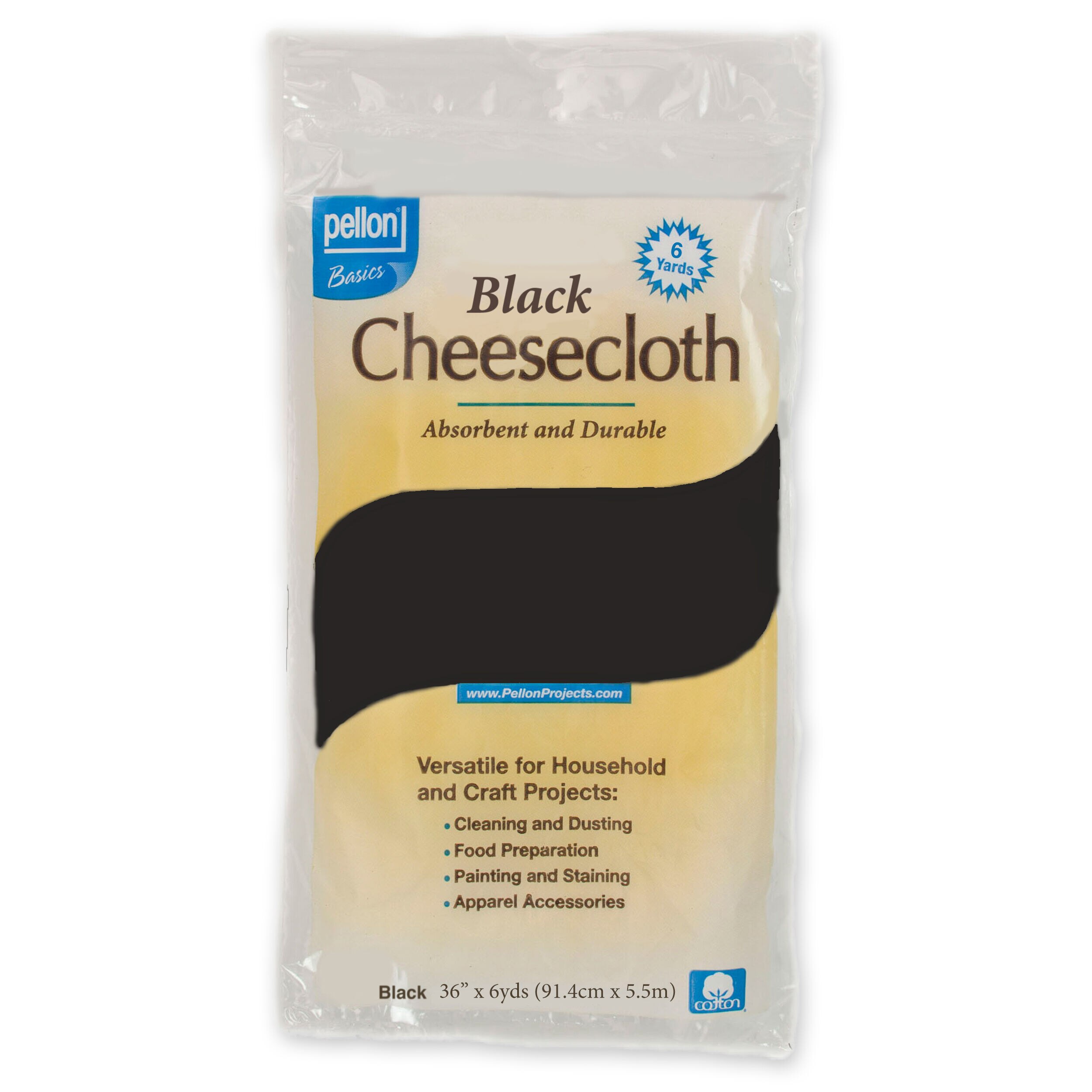 The Pellon Cheesecloth - Black will make a useful addition to your sewing supplies. This pack includes an absorbent and durable cheesecloth made from cotton that measures 36 inches x 6 yards. It sports a black shade and can be used for home decor and costume projects.