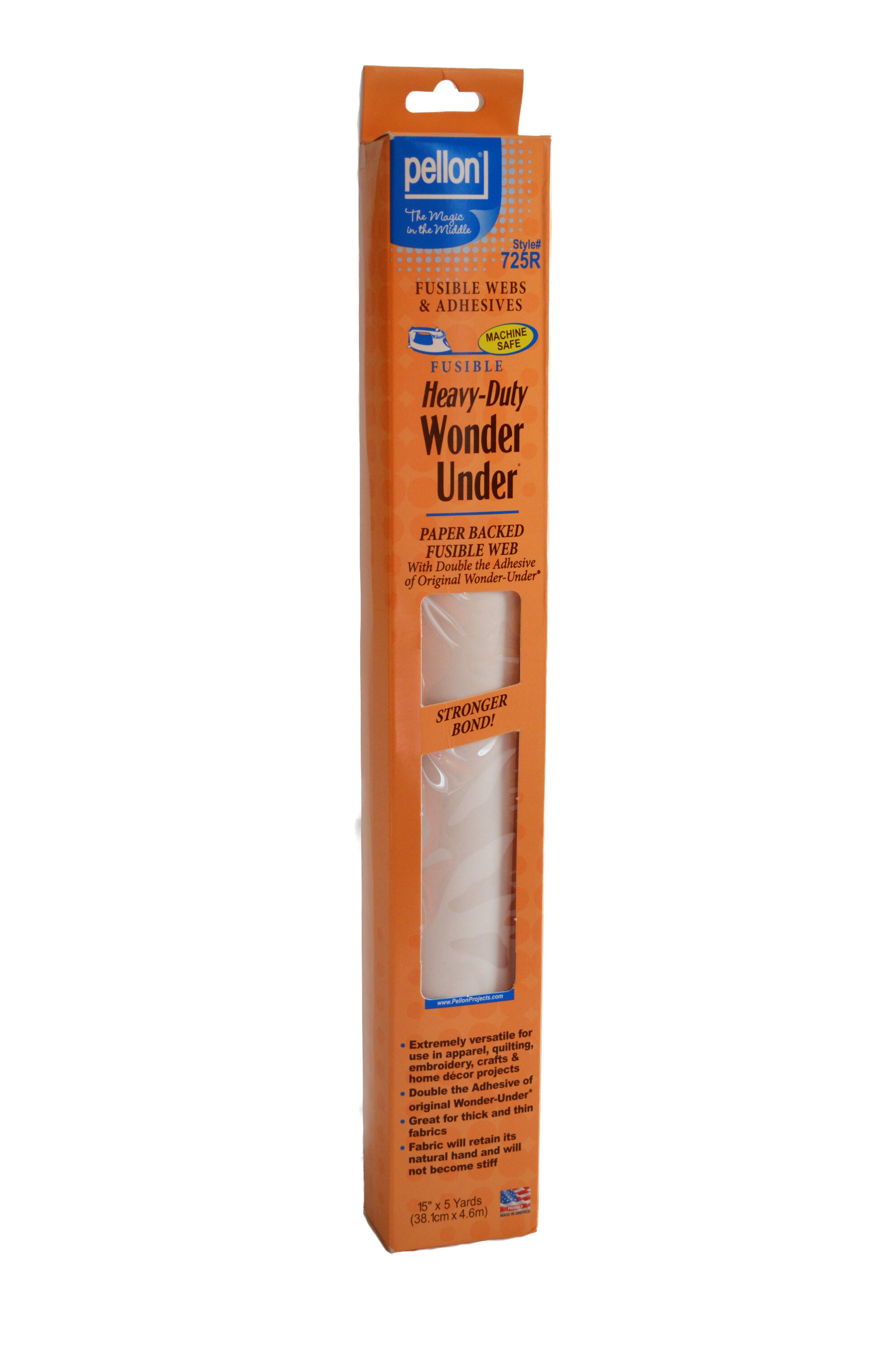 Pellon® 725 Heavy-Duty Wonder-Under® is a paper-backed fusible web with twice the adhesive of original Wonder-Under® that turns any fabric into a fusible fabric. It fuses fabric to fabric or to another porous surface such as wood or cardboard. It is especially handy with denim, canvas, or other heavy fabrics. Use Heavy-Duty Wonder-Under® when extra holding power is needed. The product has no grain and can be cut and applied in any direction. The finished item can be washed or dry-cleaned according to the fabric’s care requirements.
