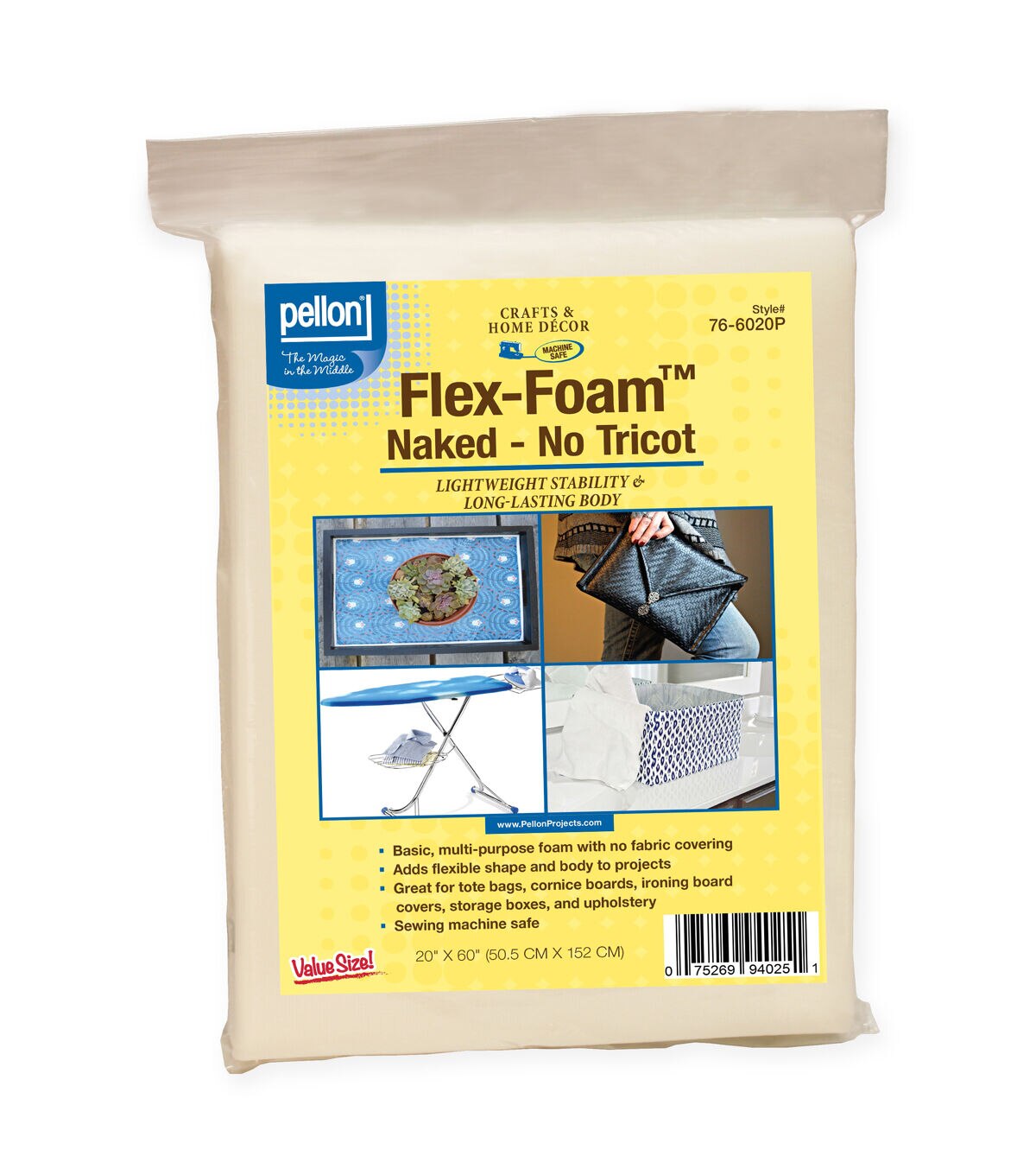 - Pellon 76 Naked Flex-Foam&trade No Tricot Foam Stabilizer 1/4 thick.20 x 60 Package. Great for any project that calls for a lofty but firm and flexible hand such as handbags, place mats, ironing boards, wall hangings, window treatments, upholstery, etc. Same product as Pellon Flex-Foam 77, 78, 79 but at a lower price point without tricot