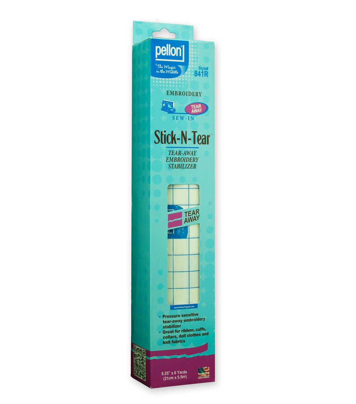 Pellon® 841 Stick-N-Tear™ is a pressure-sensitive, tear-away embroidery stabilizer that can be used in or without a hoop. It provides body and support during machine embroidery and stitching. It is ideal for fabrics that are sensitive to hoop marks and leaves no residue on your needles! Excellent for projects such as socks, ribbon crafts, cuffs, collars and silk fabrics.