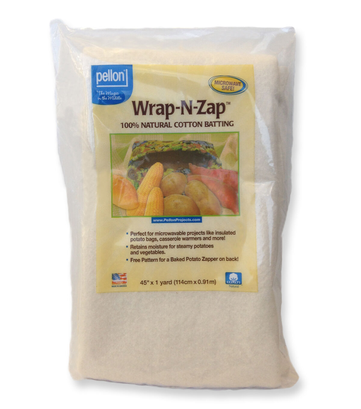 Create trendy microwavable kitchen projects using the Pellon Wrap-N-Zap Cotton Batting. It is made of natural cotton, and comes with free pattern for a baked potato zapper. Use it to craft casserole warmers, hot pads, potato bags and oven mittens. Easily steam your veggies and corn or warm buns, tortillas and rolls in a jiffy using this cotton batting that traps moisture ensuring perfect bakes. Your projects will last long when the stitched area remains less than four inches apart.