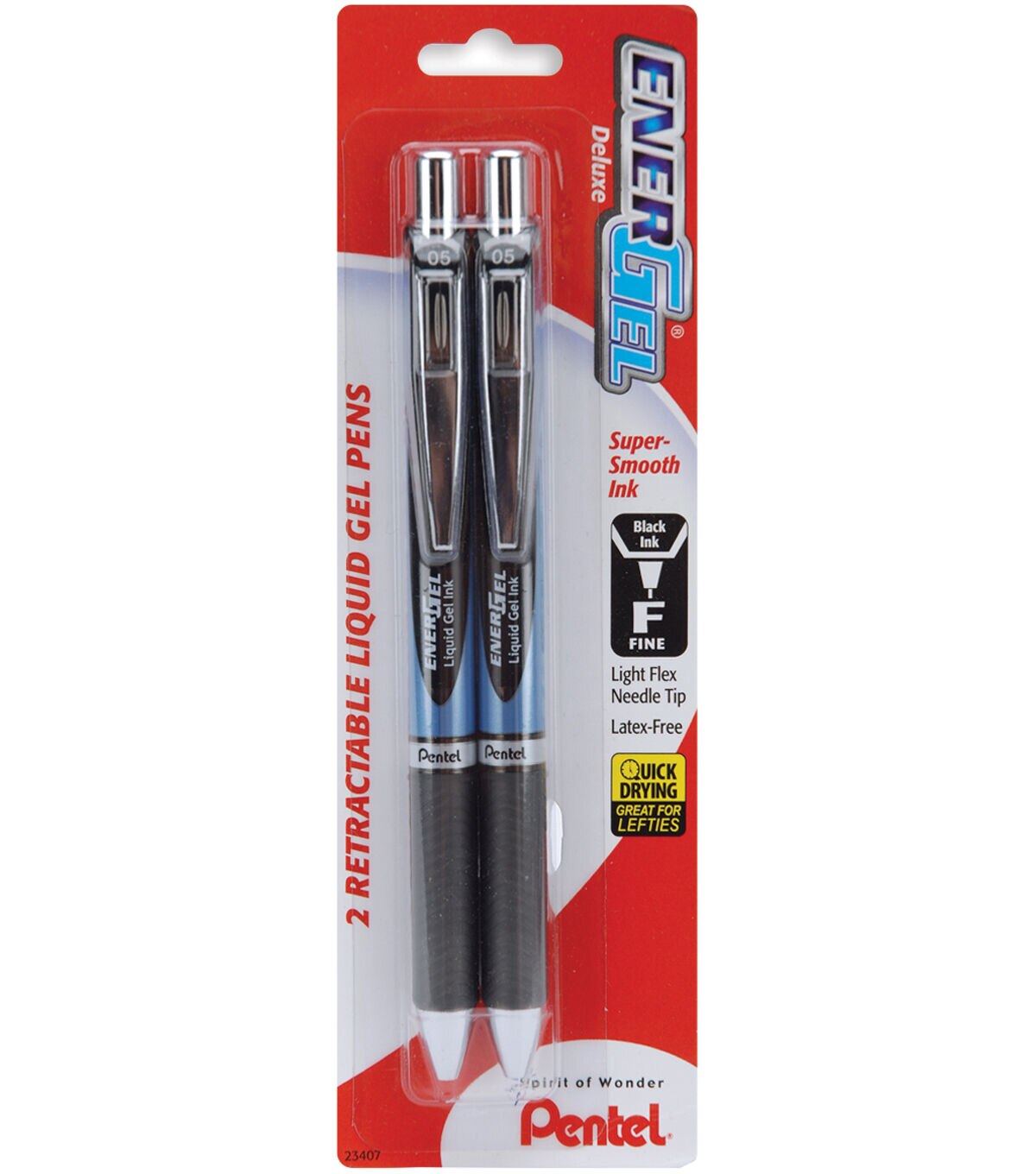 PENTEL-Energel Deluxe Retractable Liquid Gel Pens. This pen features a super-smooth blend of liquid and gel inks, a 0.5mm metal fine tip, a quick-drying ink that is perfect for lefties, acid free, a latex free grip and these pens are refillable (LNR5). This package contains two black inked pens. Imported.