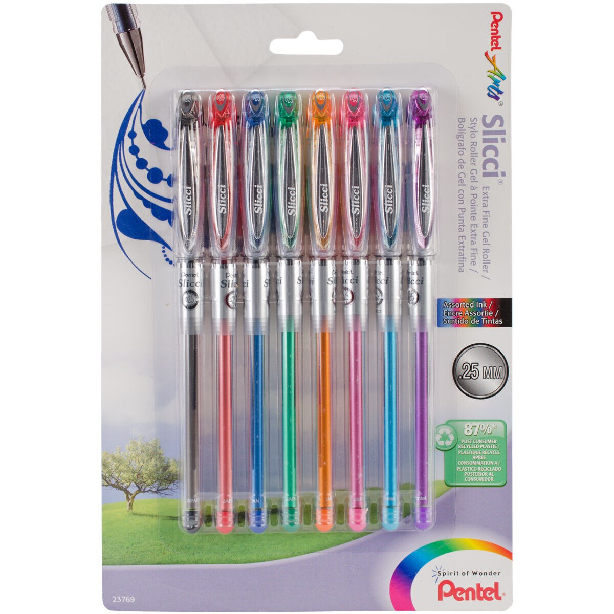 Journal, doodle or write with the Pentel Slicci Metallic Gel Pens. Featuring .25mm tips, these gel pens glide smoothly on paper and can be used to create exquisite fine lines. Use it to write messages or sentiments on greetings, scrapbook pages, gift wraps, handmade cards and other keepsakes. Package comprises eight gel pens in assorted metallic ink colors. The metallic gel pen set makes for a great gift too for kids of all age groups. Acid free. Conforms to ASTM D4236.
