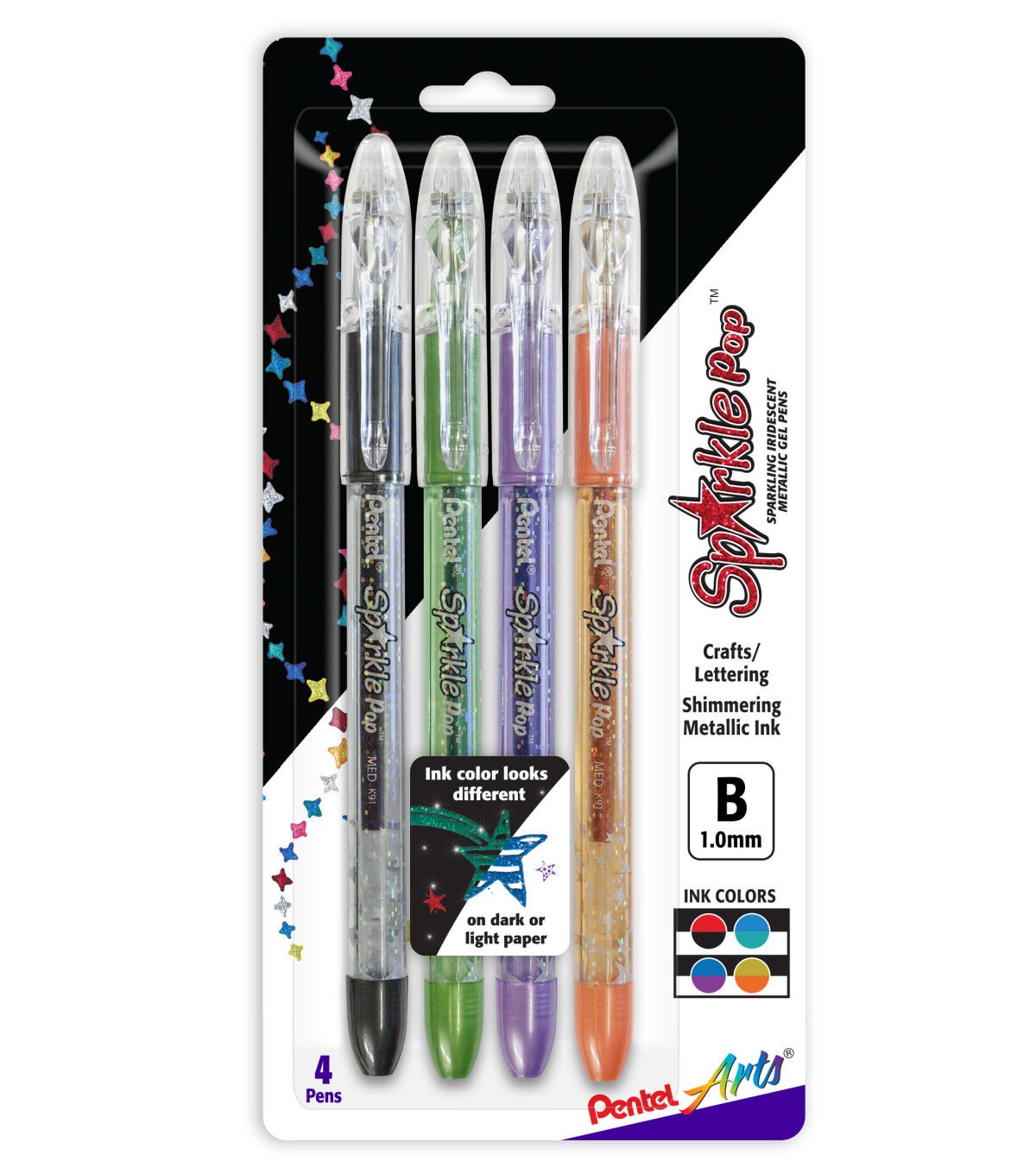 Add a unique pop of shimmering color to your writing world The glittery iridescent ink is reflective and sparkling, producing different results when writing on black or white paper. They are ideal for cards, invitations, drawing, doodles and other designs. These bold point pens have smooth gel ink and an extra-long barrel for effortless writing and control. This set includes black, green, violet and orange colors.