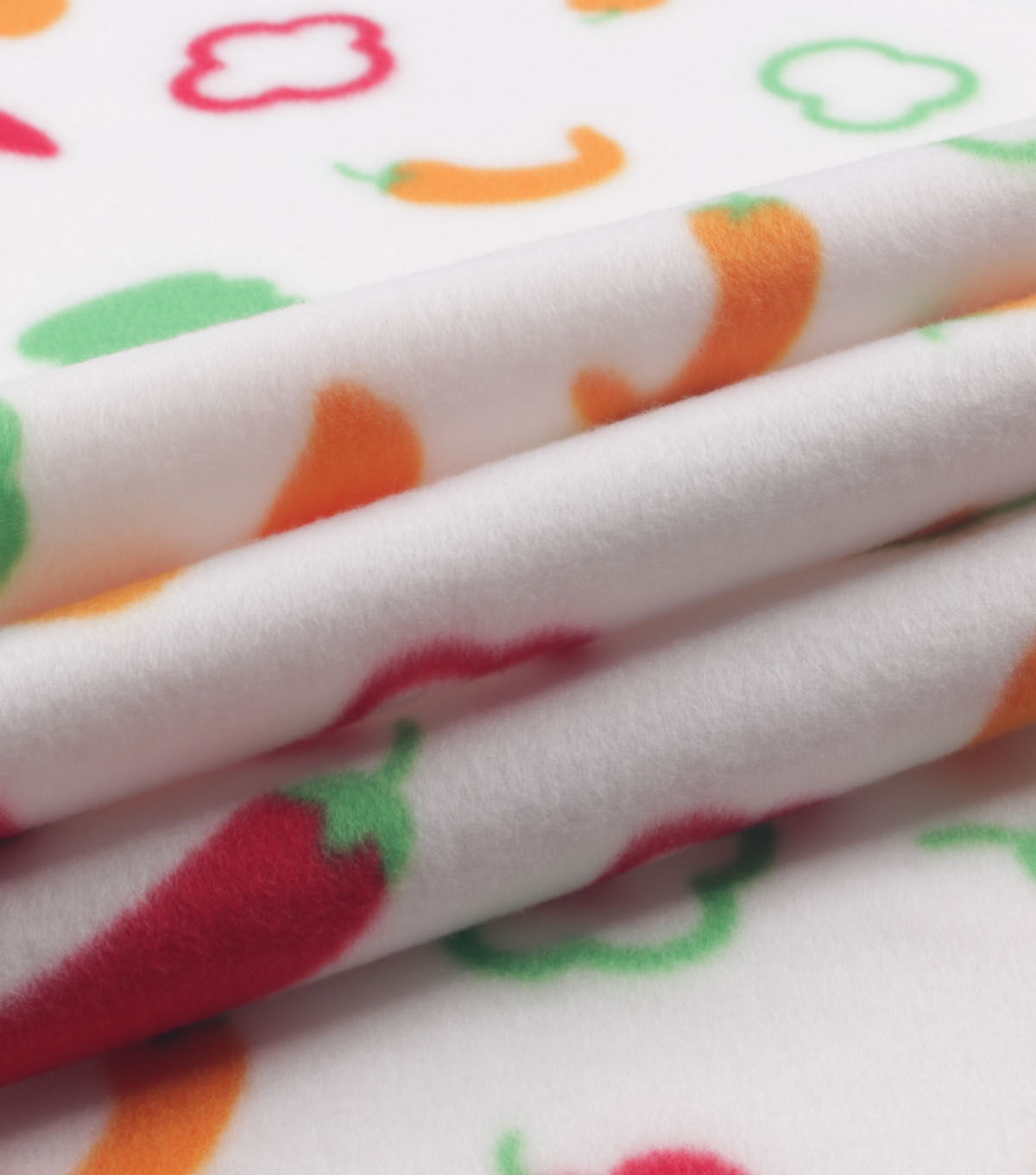 Our Peppers on White Blizzard Fleece Fabric is made of 100% polyester, making it soft and comfortable to wear. It is easy to care for, simply machine wash normal cold and tumble dry low. Do not iron and use nonchlorine bleach to keep the colors vibrant. Imported for your convenience.