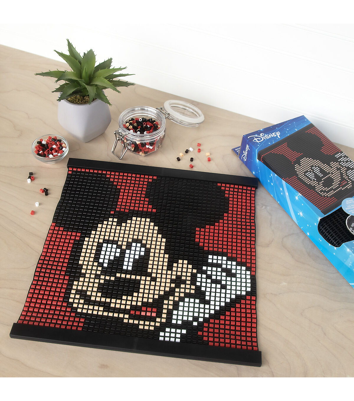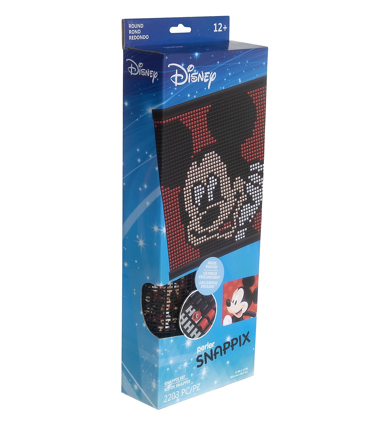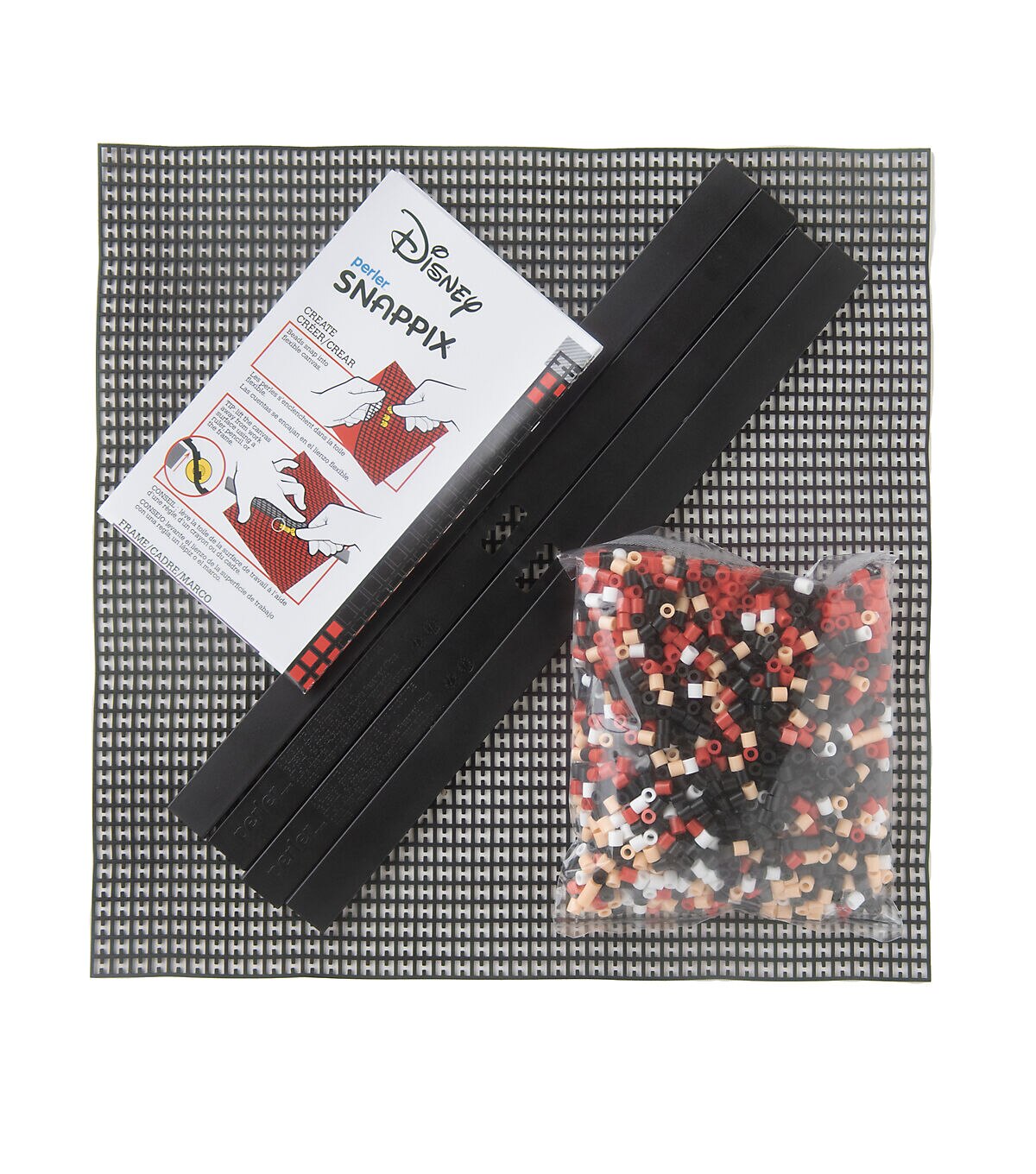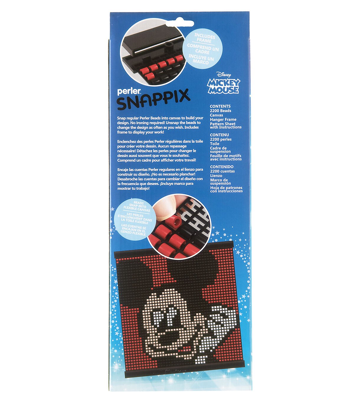 Perler has devised a cool new way to use beads to make awesome designs! Simply snap classic Perler beads onto the flexible canvas to create the most well-known Disney character, Mickey Mouse. No ironing required—beads stay securely in place! Includes a hanger frame for displaying your work. Finished size: 12" x 12". For ages 12 and up. Kit contains 2200 round beads, mesh canvas, hanger frame, and pattern sheet with instructions. © Disney www.disney.com.