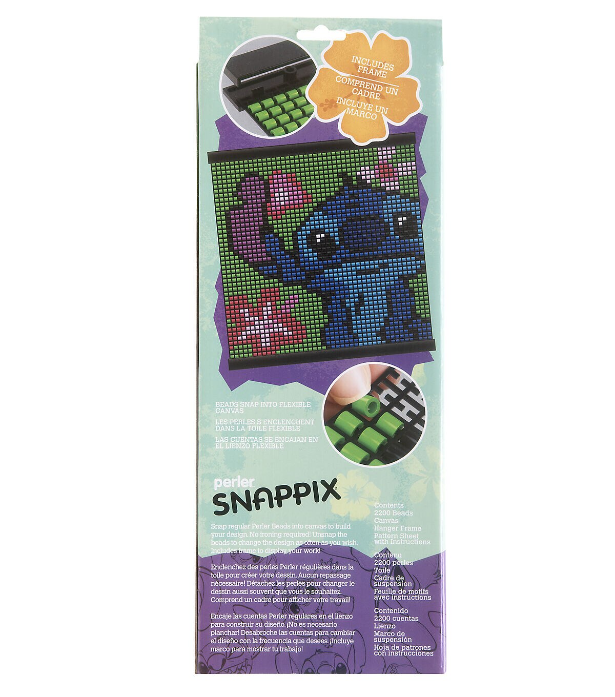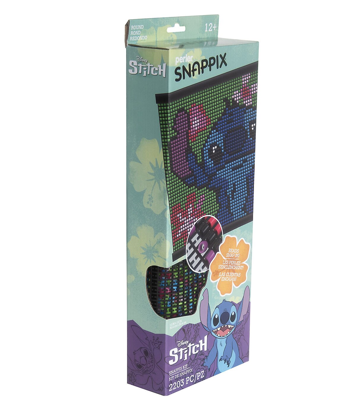 Perler has devised a cool new way to use beads to make awesome designs! Simply snap classic Perler beads onto the flexible canvas to create the mischievous Disney character, Stitch. No ironing required—beads stay securely in place! Includes a hanger frame for displaying your work. Finished size: 12" x 12". For ages 12 and up. Kit contains 2200 round beads, mesh canvas, hanger frame, and pattern sheet with instructions. © Disney www.disney.com.