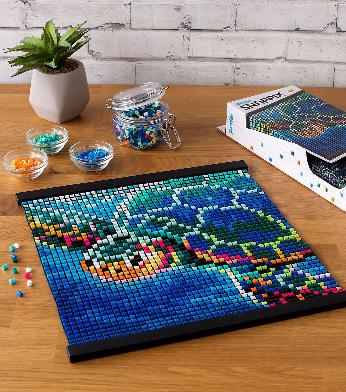 Perler has devised a cool new way to use beads to make awesome designs! Simply snap classic Perler beads onto the uniquely designed flexible canvas to create this colorful sea turtle. No ironing required—beads stay securely in place! Includes a hanger frame for displaying your work. Finished size: 12" x 12". For ages 12 and up. Kit contains 2200 round beads, mesh canvas, hanger frame, and pattern sheet with instructions.