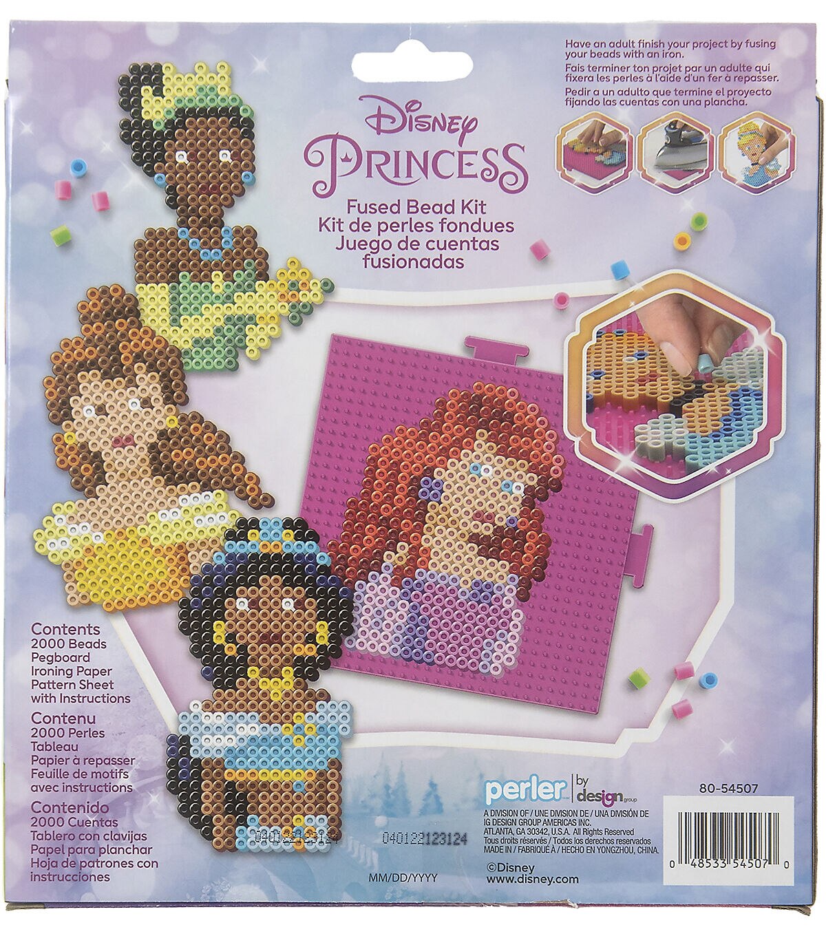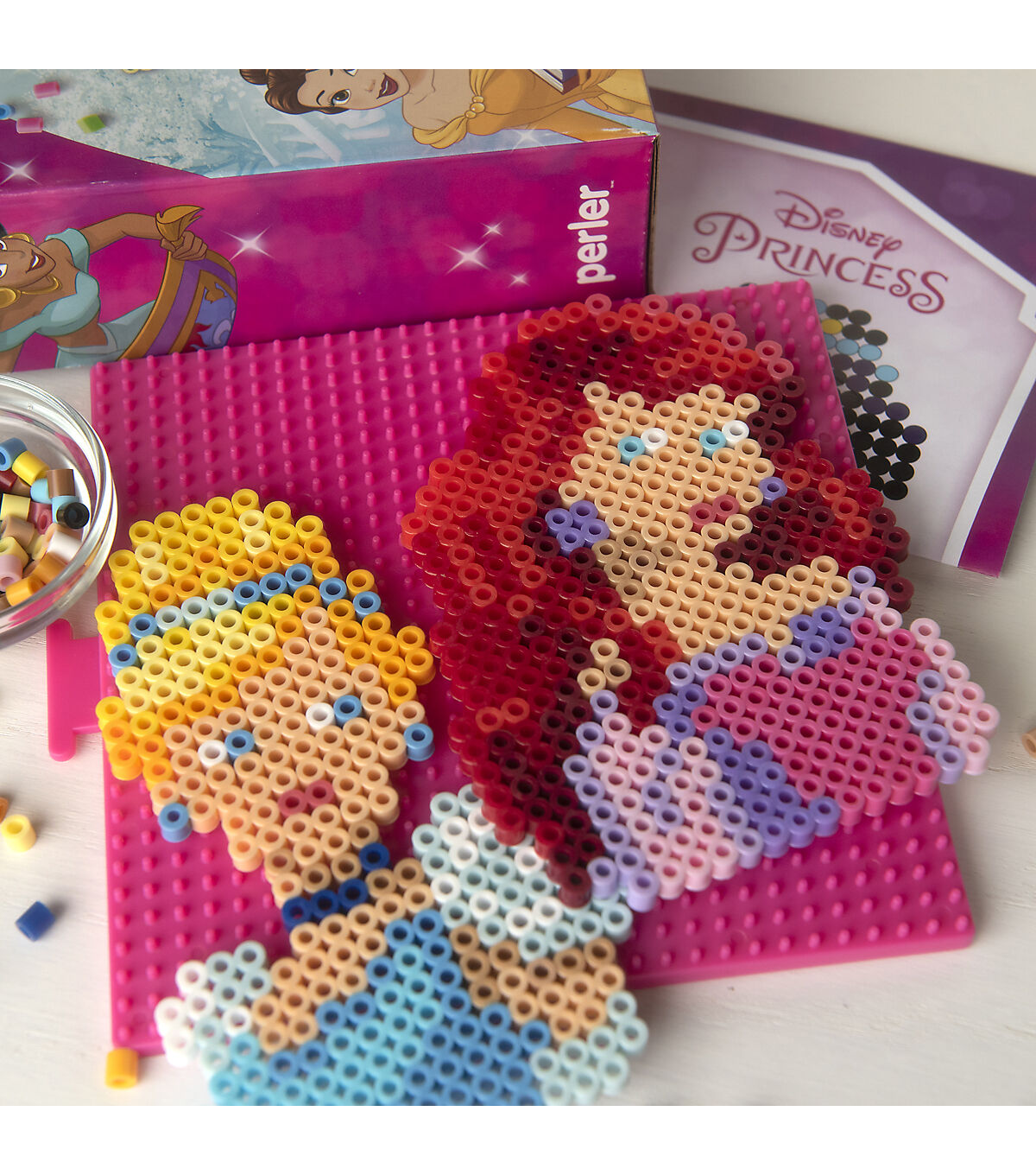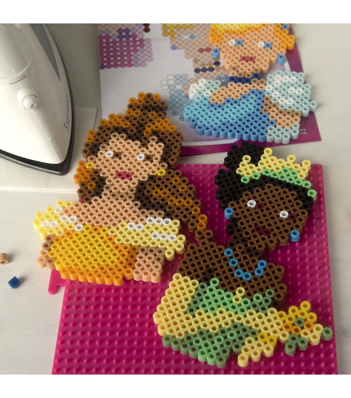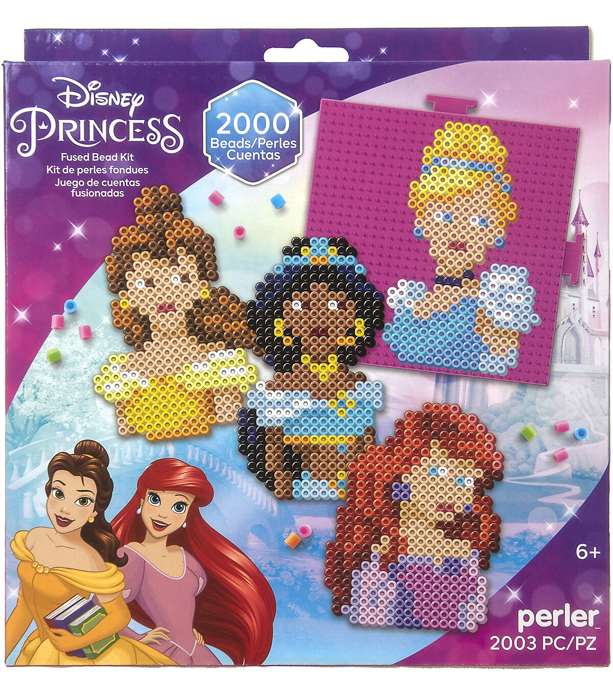 Create some of Disney's most beloved princesses with this fuse bead kit from Perler. Patterns included to make Belle, Cinderella, Jasmine, and more—5 projects in all to keep young hands busy! Perler beads are great for promoting fine motor skills, color recognition, and imaginative play. Ironing to be done by an adult only. Designed for ages 6 and up. Disney. www.disney.com