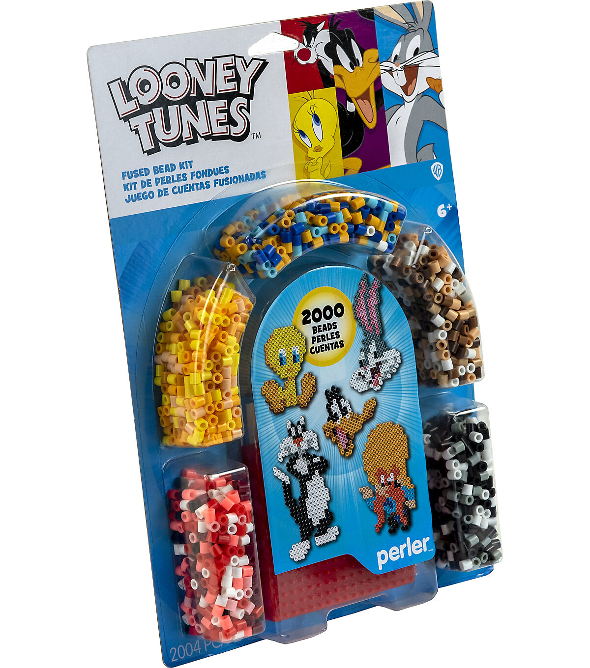 Create some of your favorite Looney Tunes cartoon characters such as Bugs Bunny, Road Runner, Porky Pig, Yosemite Sam, and more with this fun fused bead kit from Perler. Patterns included to make 8 characters. Perler beads are great for promoting fine motor skills, color recognition, and imaginative play. Designed for ages 6 and up. Ironing to be done by an adult only. LOONEY TUNES and all related characters and elements Warner Bros. Entertainment Inc.