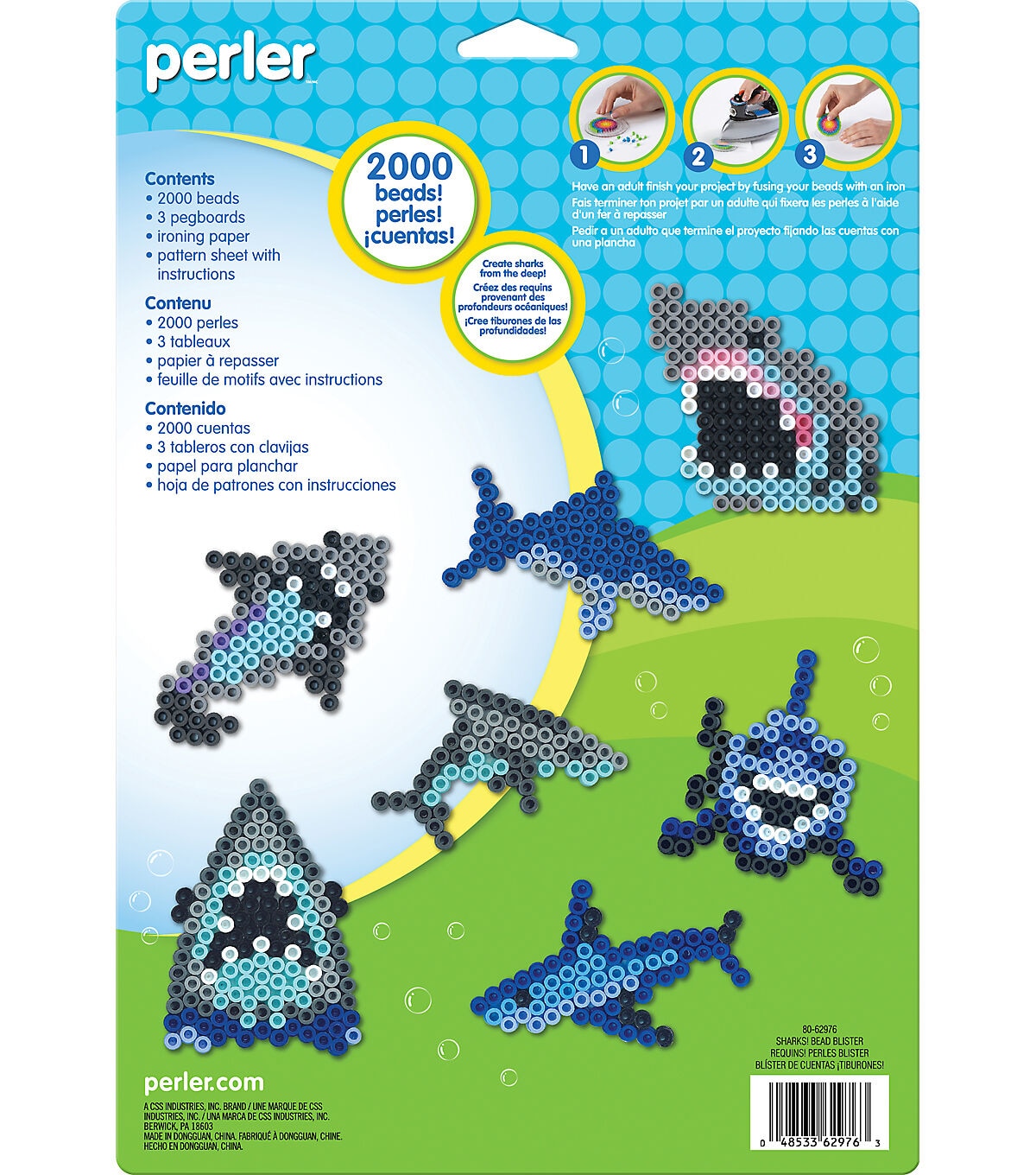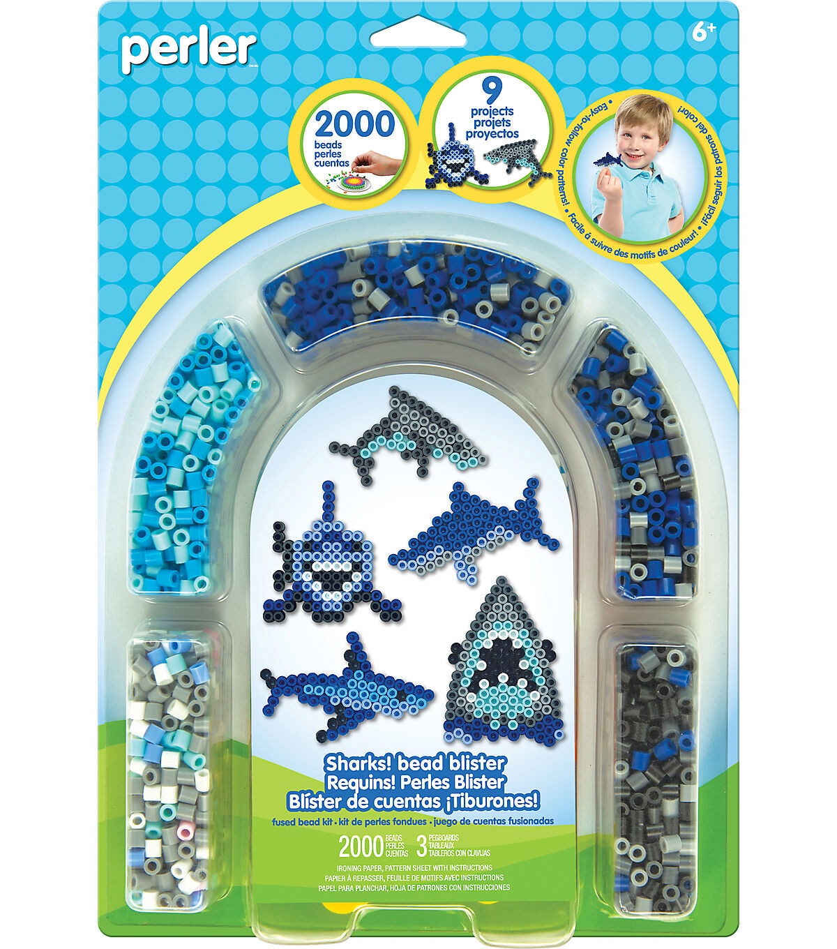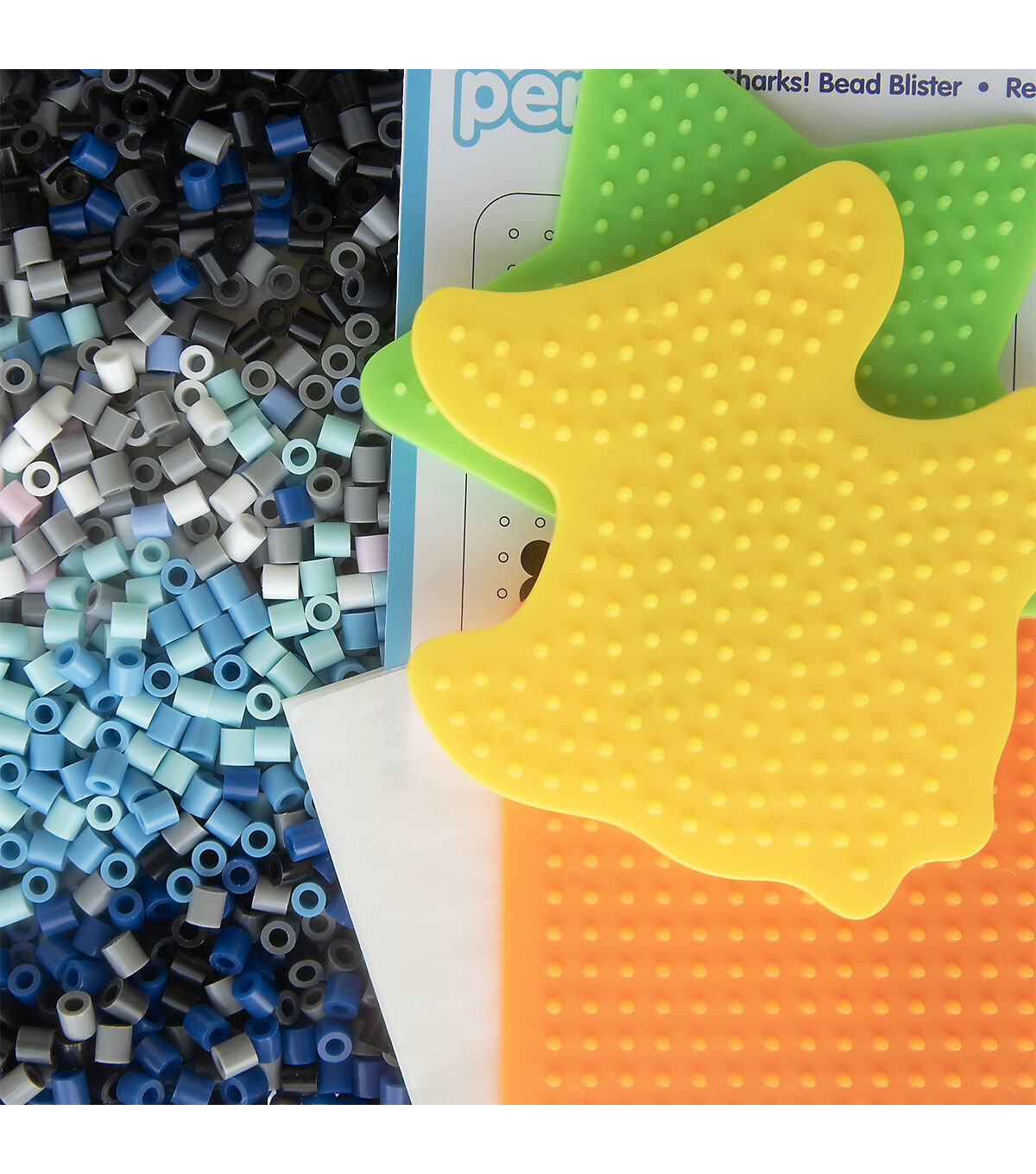 - Kit includes: 2000 beads, 3 Pegboards: small square, fishy and 5pt star, Ironing paper, Pattern Sheet with Instructions