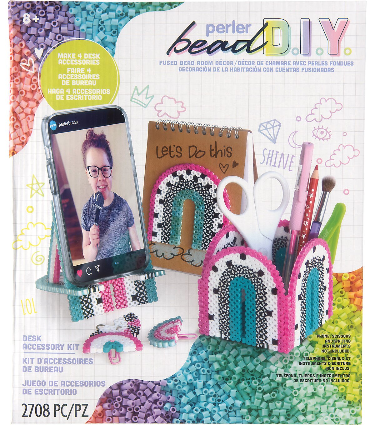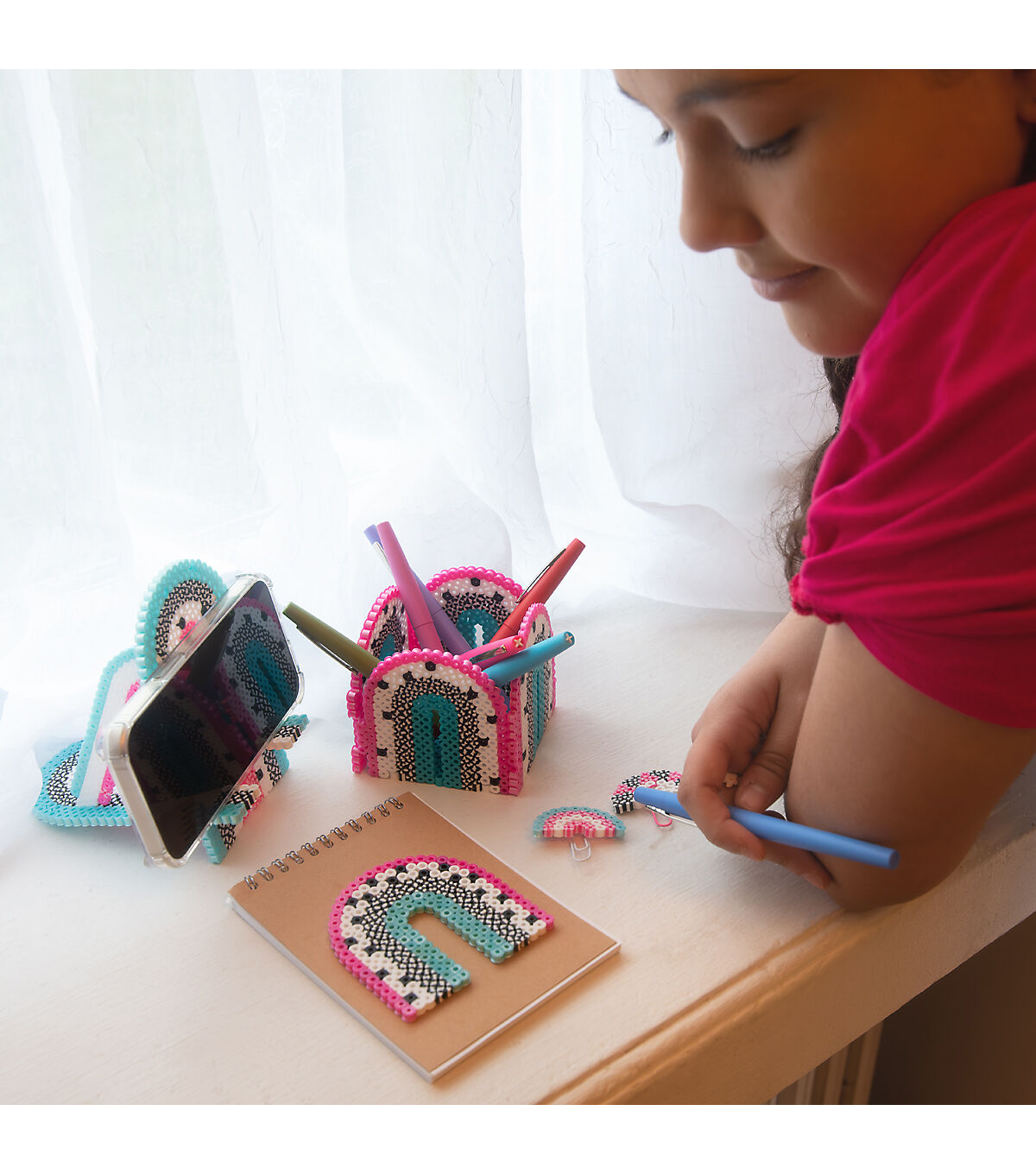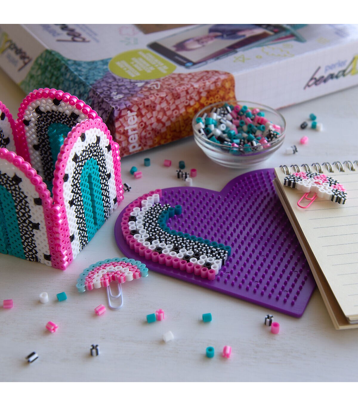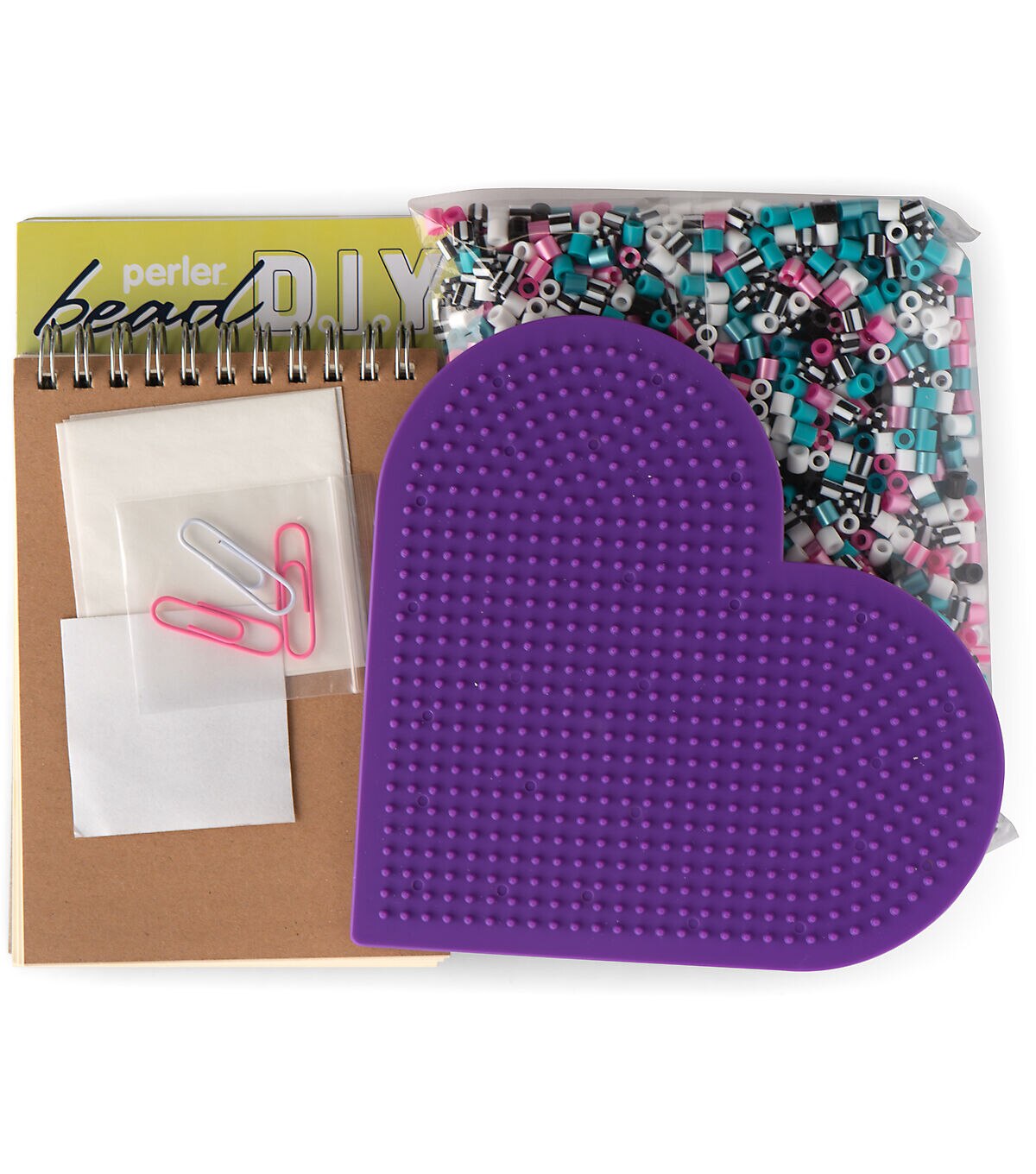 Create your own desk accessory kit with Perler fuse beads to keep things organized. This fun kit includes patterns and assembly instructions for a pencil cup, cell phone stand, paper clip toppers, and a notebook cover. For ages 8 and up. Kit contains 2700 beads, pegboard (large heart), pattern sheet with instructions, ironing paper, 75-page spiral-bound notebook (3.75 x 5.5 inches), adhesive paper, and 3 paper clips. Ironing to be done by an adult only. Pegboard and ironing paper are reusable.