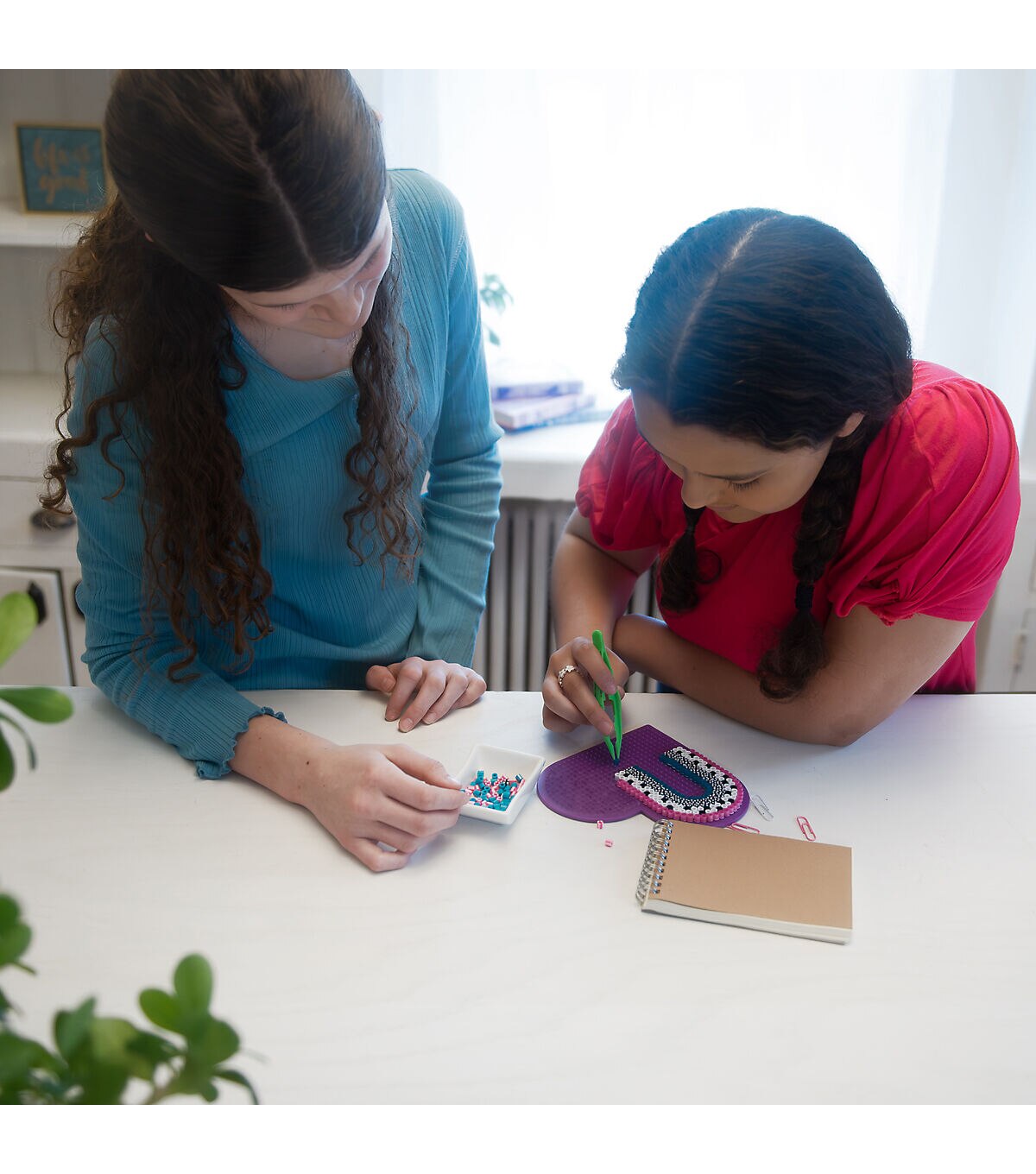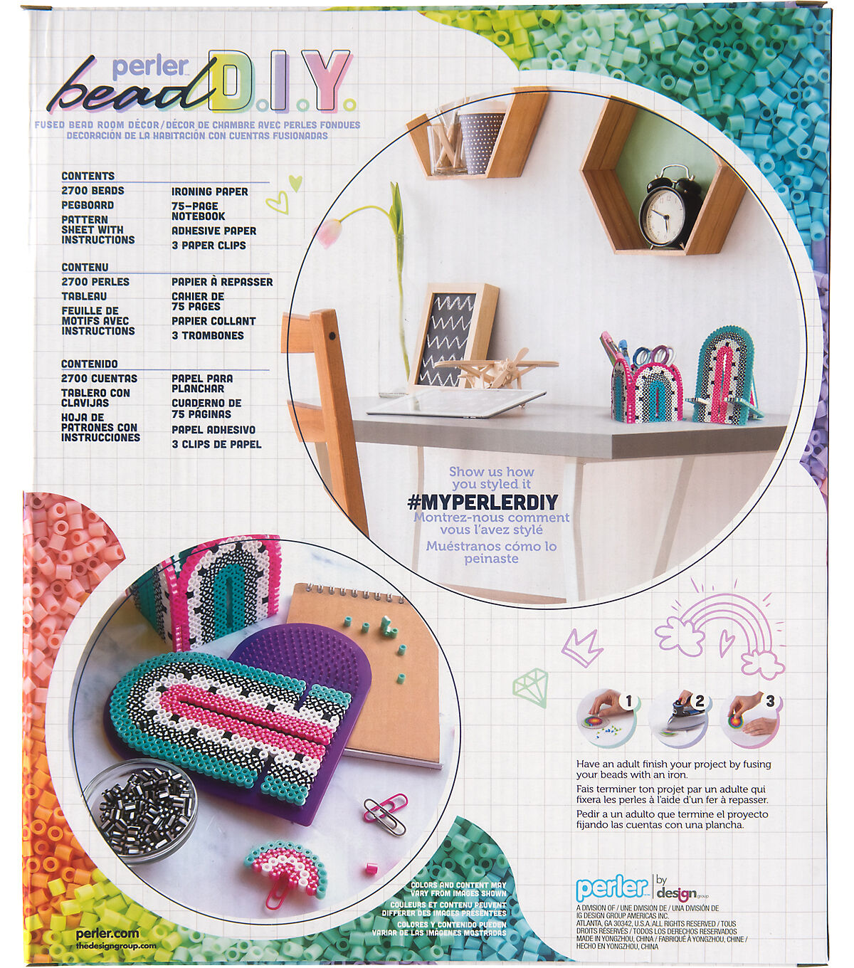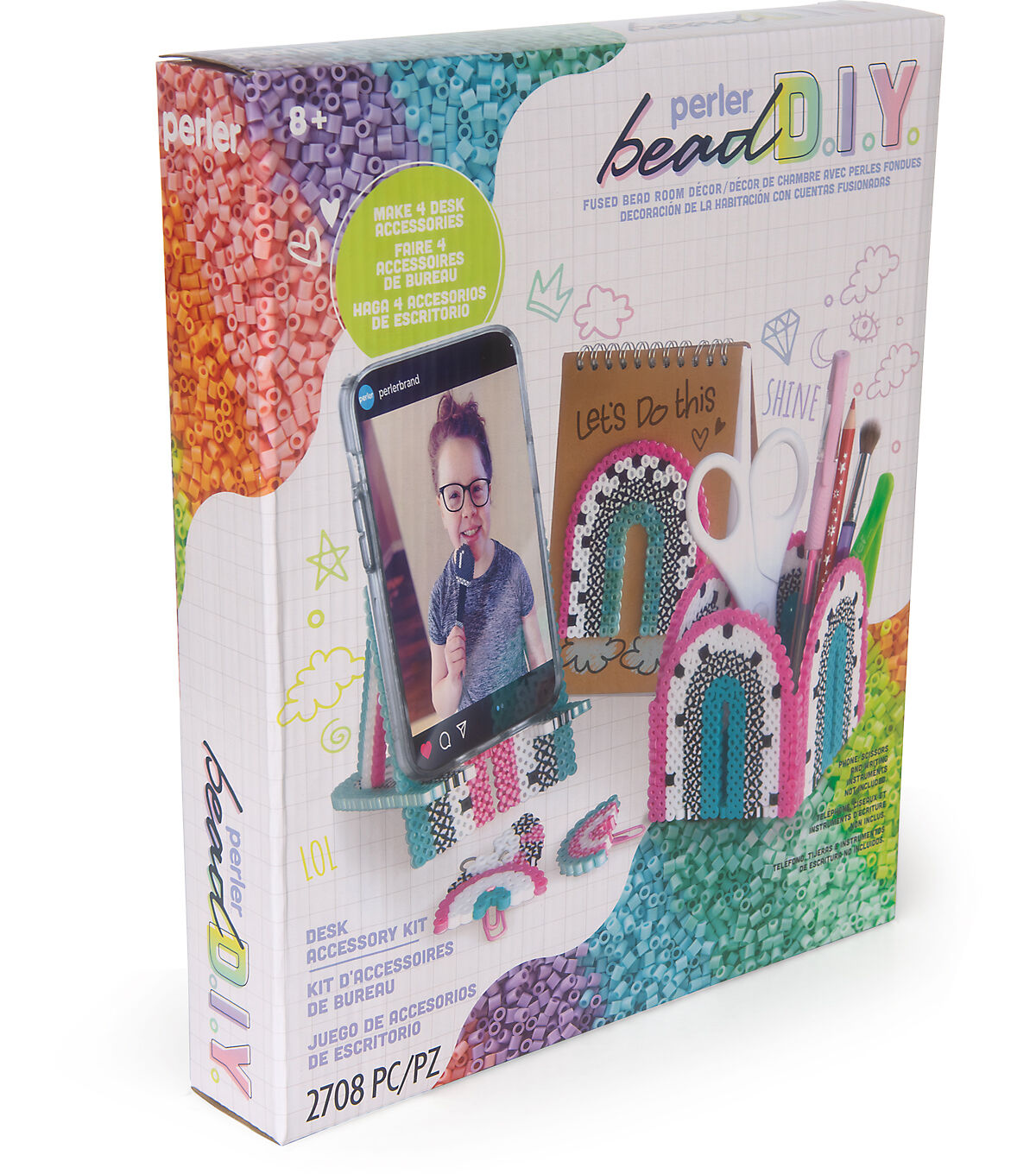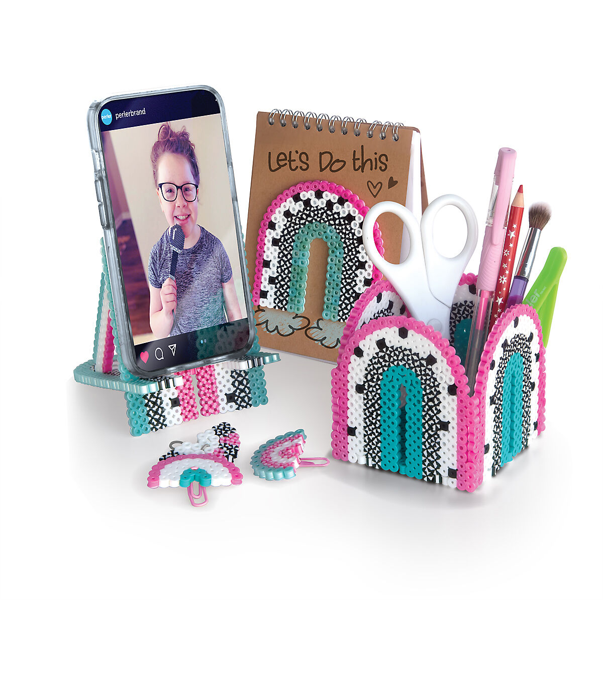 Create your own desk accessory kit with Perler fuse beads to keep things organized. This fun kit includes patterns and assembly instructions for a pencil cup, cell phone stand, paper clip toppers, and a notebook cover. For ages 8 and up. Kit contains 2700 beads, pegboard (large heart), pattern sheet with instructions, ironing paper, 75-page spiral-bound notebook (3.75 x 5.5 inches), adhesive paper, and 3 paper clips. Ironing to be done by an adult only. Pegboard and ironing paper are reusable.
