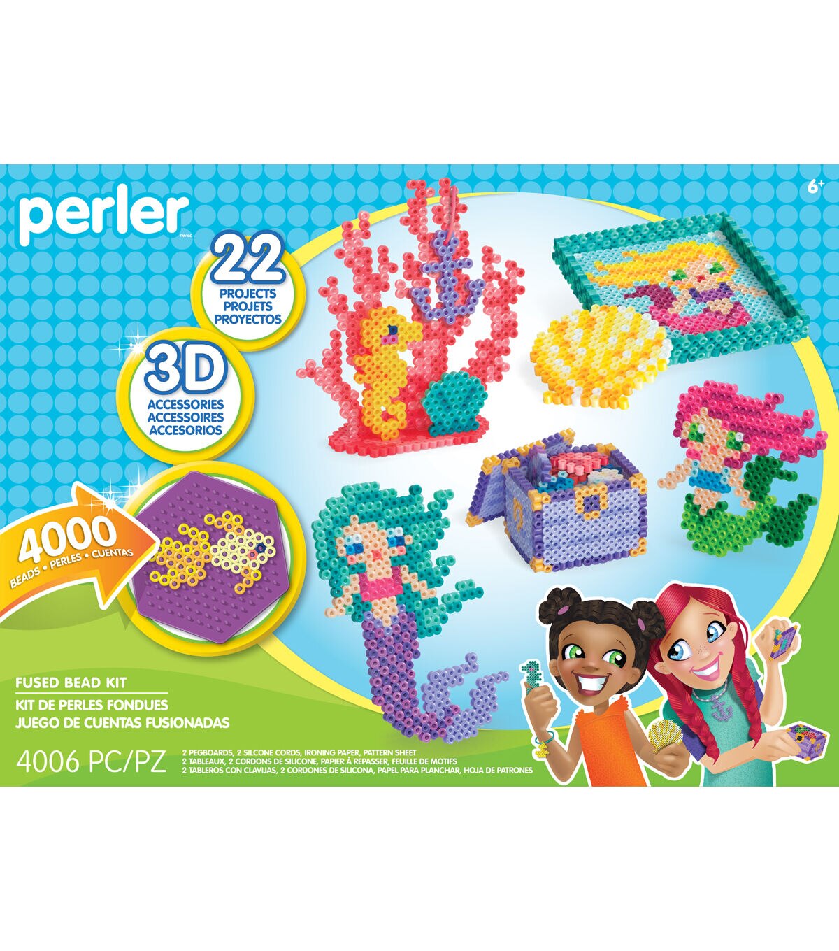 Immerse yourself in the magical world of Mermaids with this Deluxe Activity Kit. Makes 22 projects, and is perfect for gifts and playdates! For ages 6 and up. This Perler fuse bead kit includes 4000 beads, 1 large interlocking square pegboard, 1 small hexagon pegboard, 1 break-away necklace, 1 break-away bracelet, ironing paper, a pattern sheet featuring 22 designs, and easy instructions. Bead colors include: light pink, bubblegum, blush, hot coral, red, magenta, raspberry, pastel yellow, yellow, cheddar, kiwi lime, green, dark green, light green, parrot green, turquoise, toothpaste, dark blue, light lavendar, pastel lavender, plum, purple, sand, and white.
