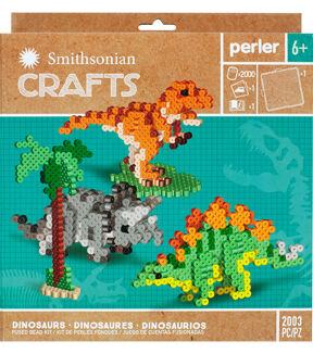 Create a 3-dimensional Tyrannosaurus Rex, Stegosaurus, and Triceratops with this amazing fuse bead kit from Perler and Smithsonian Crafts. The Dinosaurs kit includes 2000 beads, pegboard, pattern sheet with instructions, and ironing paper. © 2019 Smithsonian.