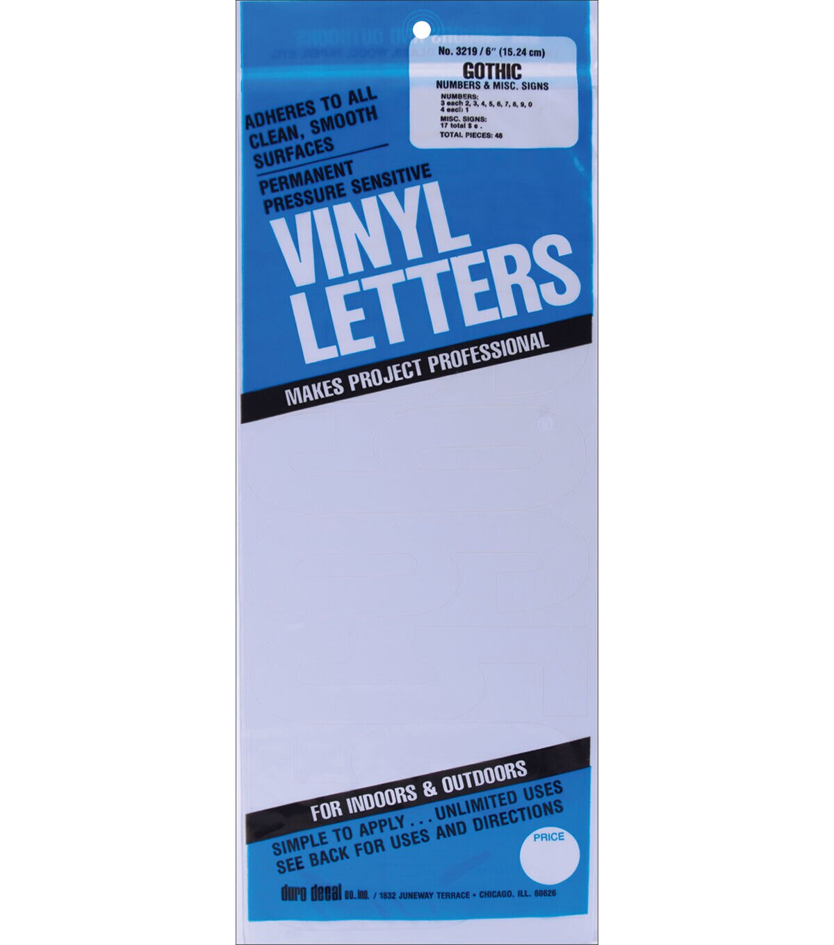 Duro-Vinyl Numbers: 6in Gothic. These vinyl letters are great for all clean and smooth surfaces where you want permanent lettering: glass, metal, plastic and fiberglass which makes them perfect for mailboxes, windows, boats, campers, vehicles, posters, signs, lockers, wagons, bumpers and much more at home, school and the office. This package contains forty-eight pieces: four 1s, three each: 2s, 3s, 4s, 5s, 6s, 7s, 8s, 9s and 0s and seventeen symbols. Available in a variety of colors: each sold separately. Made in USA.