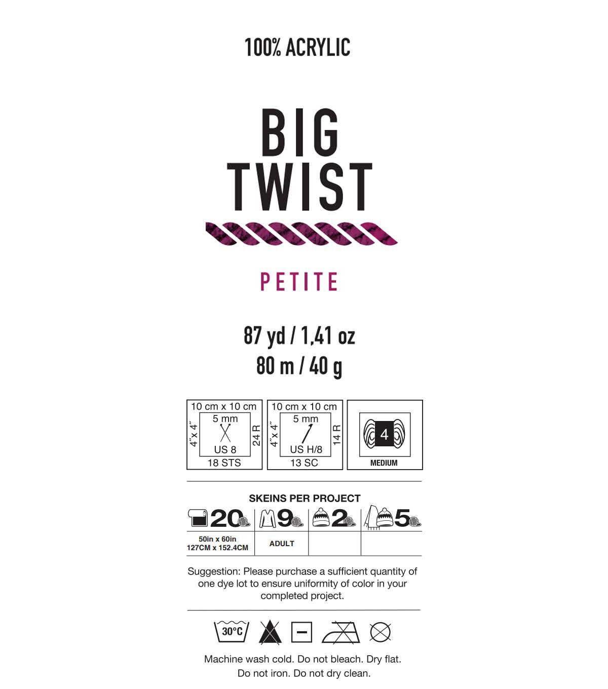 Big Twist PETITE yarn is a 100% acrylic yarn with many lovely colors, yarn weight is 4, perfect size for knit and crochet, and easy care. Durable, functional and affordable, This yarn is perfect for multi-color combined projects, handstuff works, Community activities and school teaching, and so on.