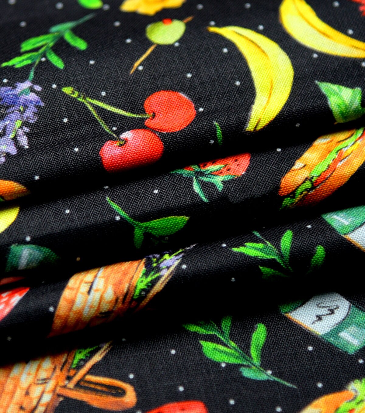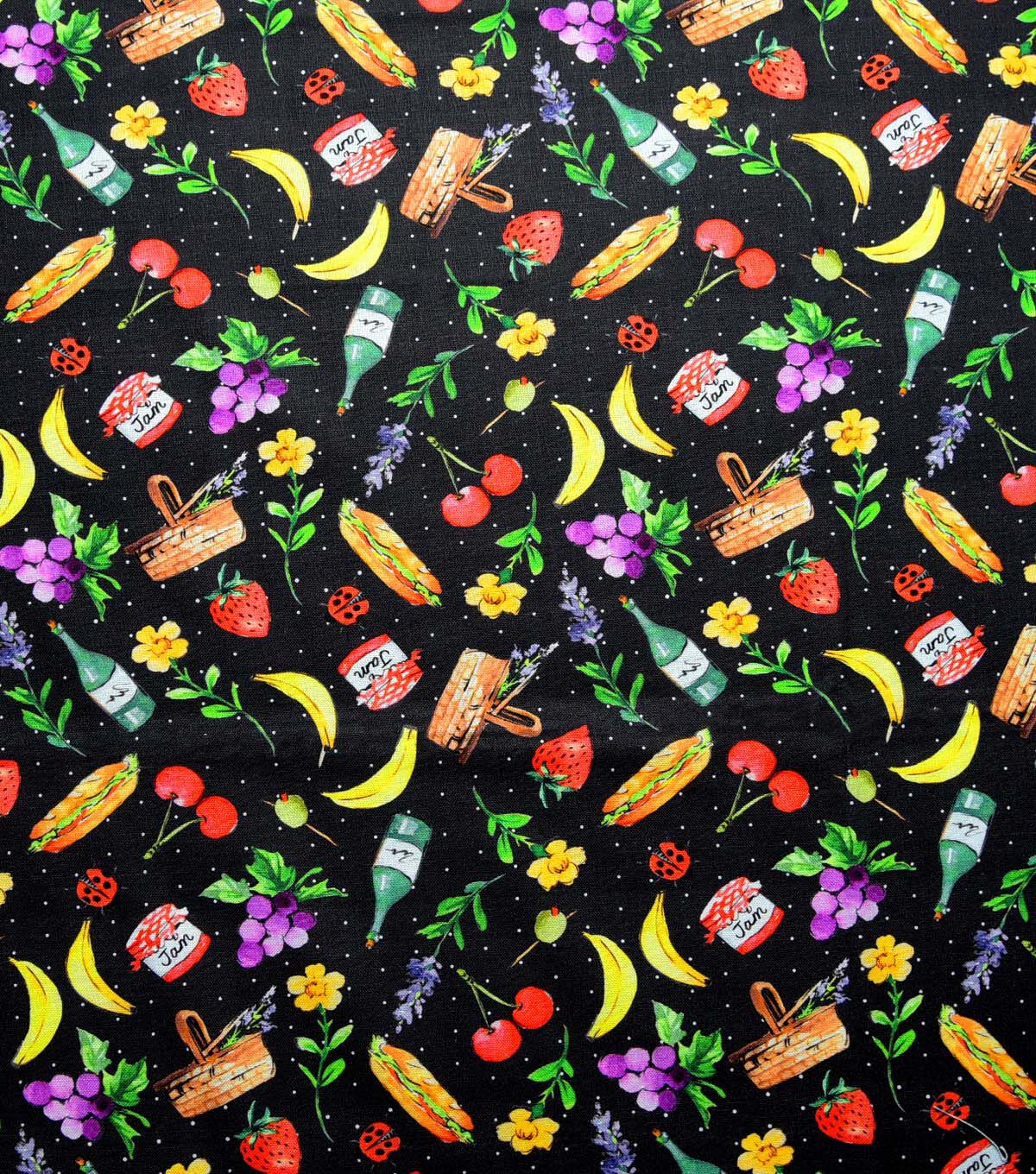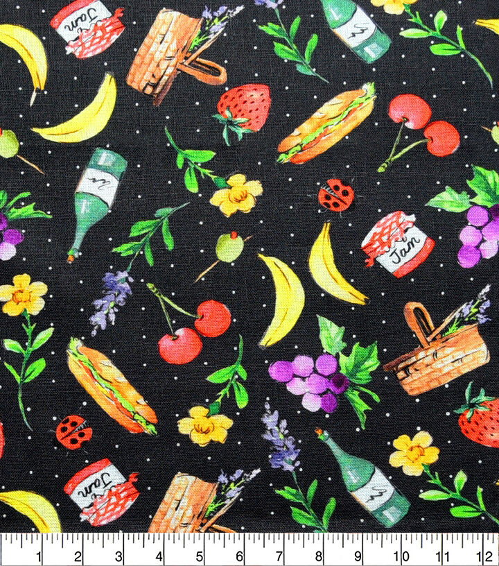 • Picnic Necessities On Black Novelty Cotton Fabric