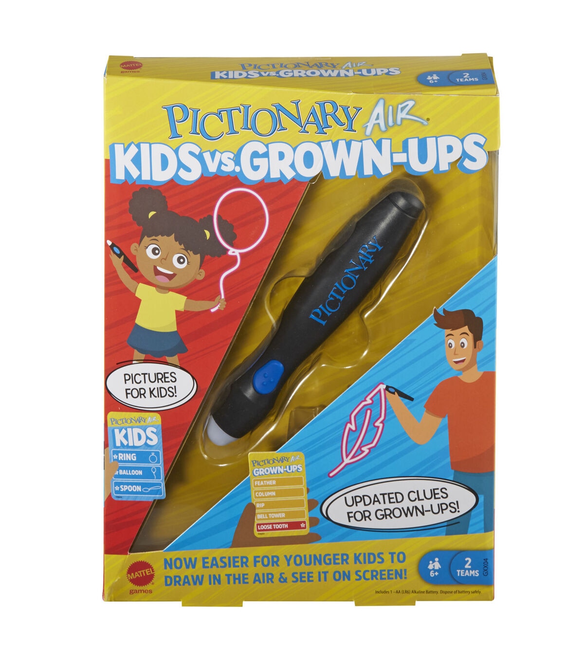 Pictionary Air Kids vs. Grown-Ups is a hysterical way to play the classic family drawing game! Adults use the updated classic clues while kids have clues that include illustrations, making it easier for children as young as 6 years old to join in the fun! Interact with the drawings, as in charades, to make this even more of an exciting twist on the quick-draw classic.