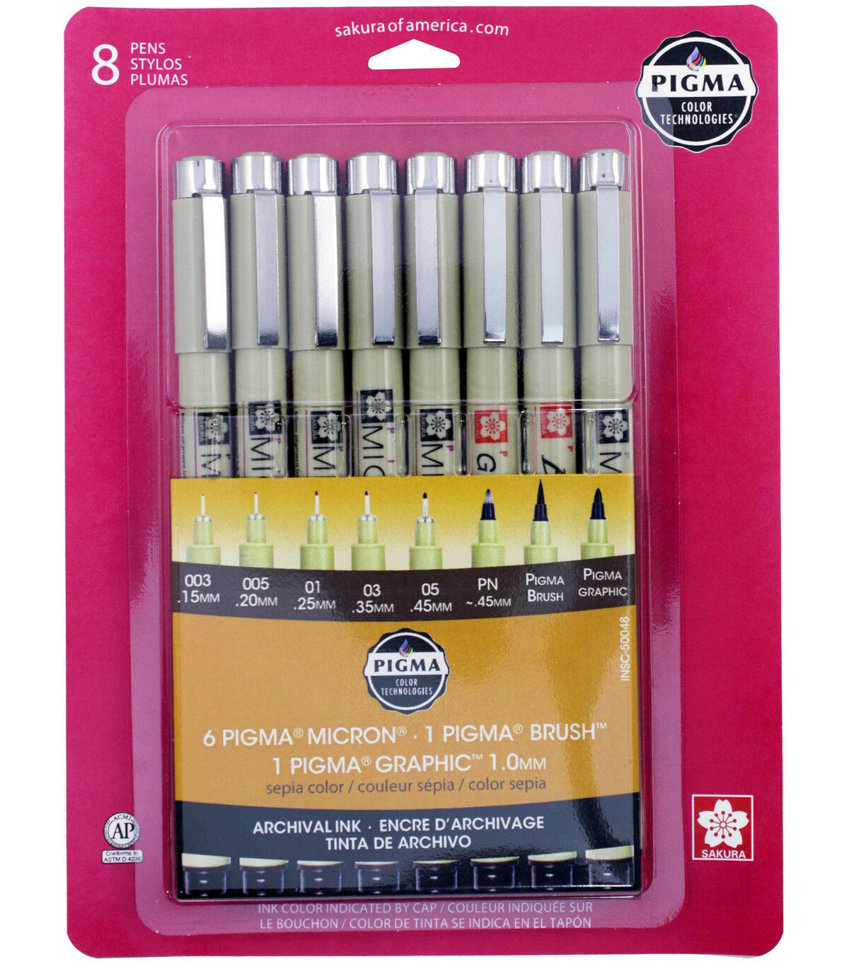 Pigma Micron Pens-Sepia have a waterproof, quick-drying pigment ink that will not feather or bleed through even the thinnest papers. This pack contains eight pens in sizes 005 0.2mm, 01 0.25mm, 02 0.3mm, 03 0.35mm, 05 0.45mm and 08 0.5mm.