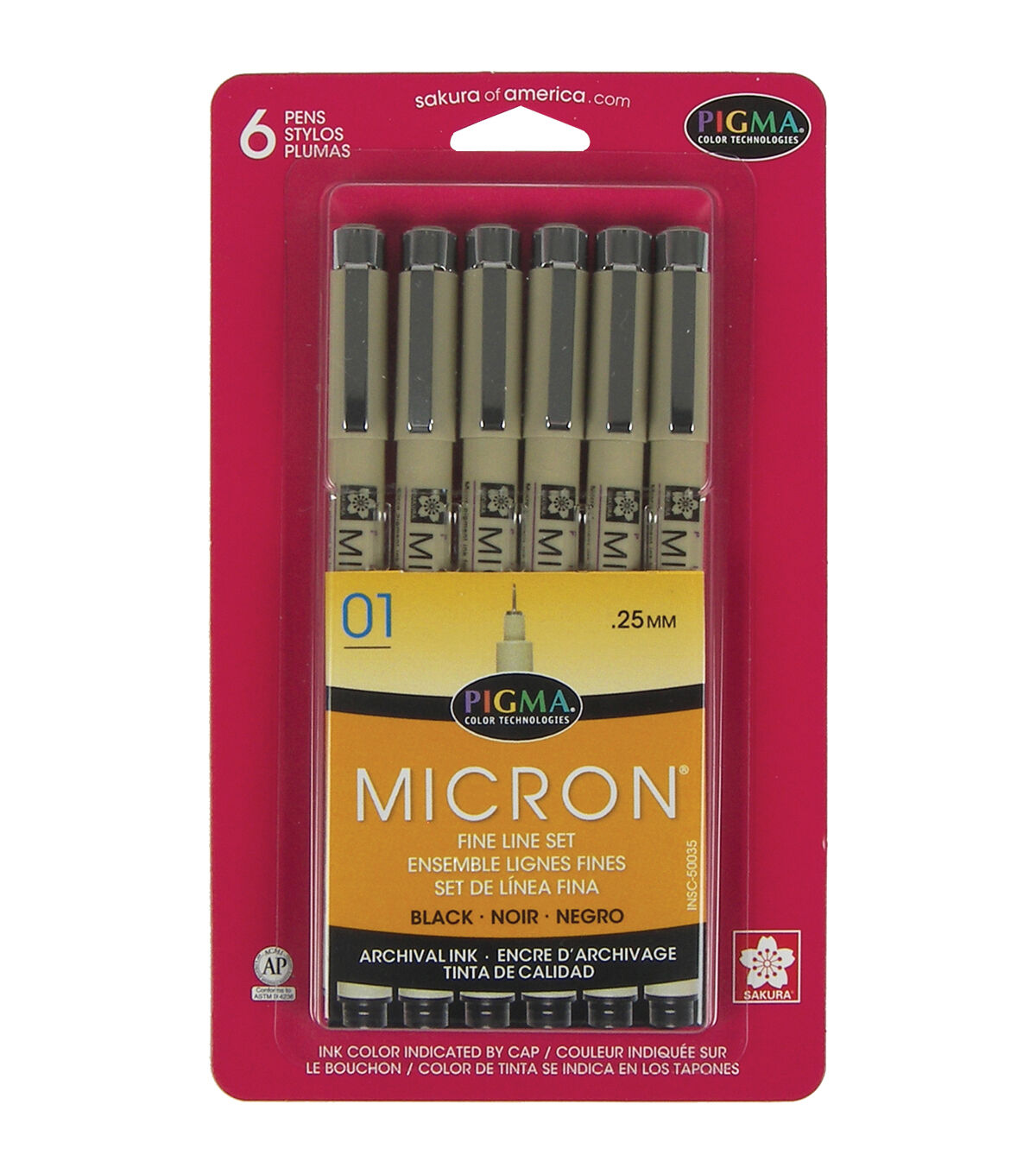 Sakura-Pigma Micron Pens 01 .25mm: Black. Archival quality ink is waterproof, chemical resistant, fade resistant, bleed free, quick drying and pH neutral. Ideal for sketching, inking, illustration and Zentangle. This package contains six 01 black micron pens with fine line tips. Conforms to ASTM D 4236. Imported.