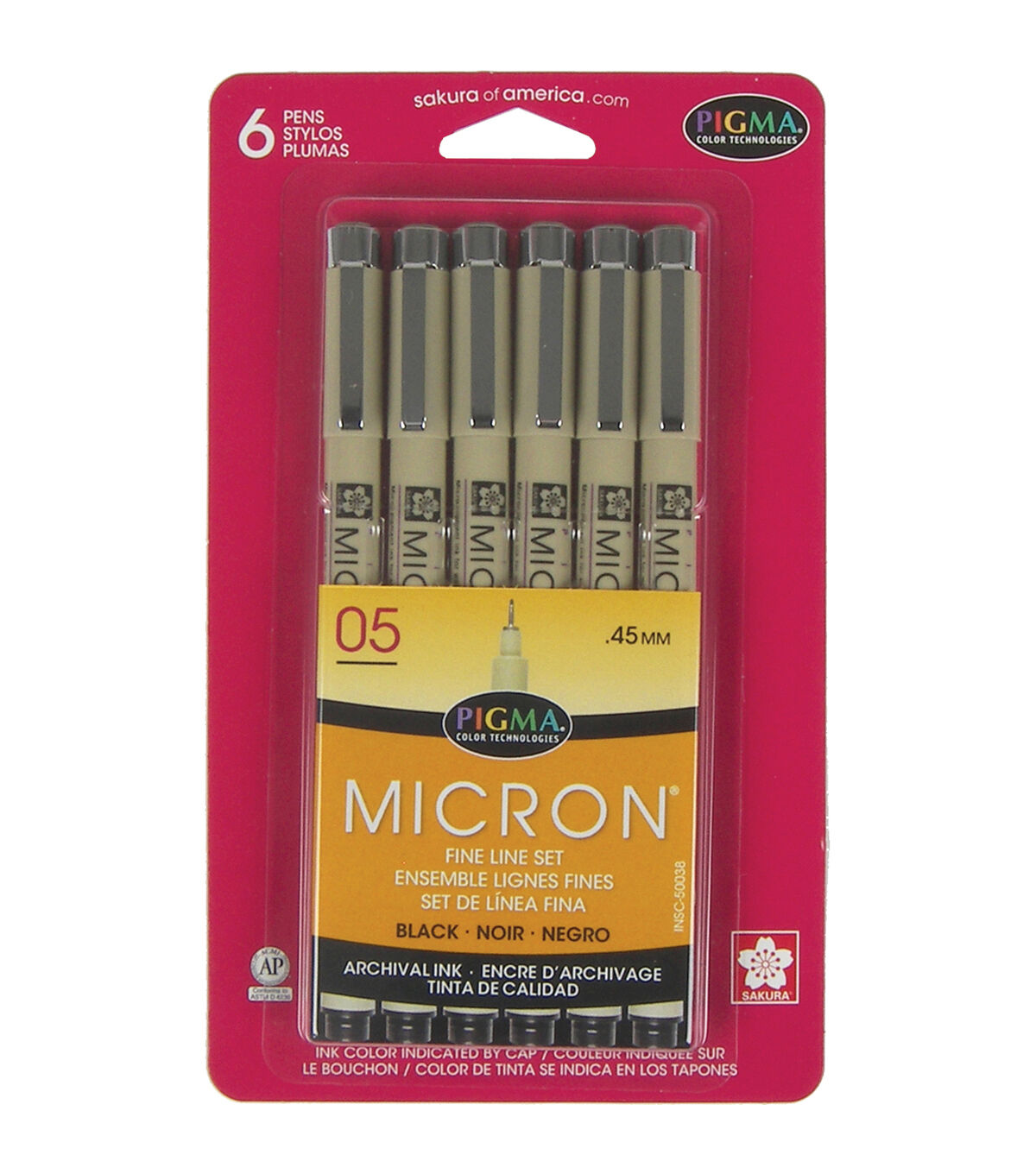 Sakura-Pigma Micron Pens 05 .45mm: Black. Archival quality ink is waterproof, chemical resistant, fade resistant, bleed free, quick drying and pH neutral. Ideal for sketching, inking, illustration and Zentangle. This package contains six 05 black micron pens with fine line tips. Conforms to ASTM D 4236. Imported.