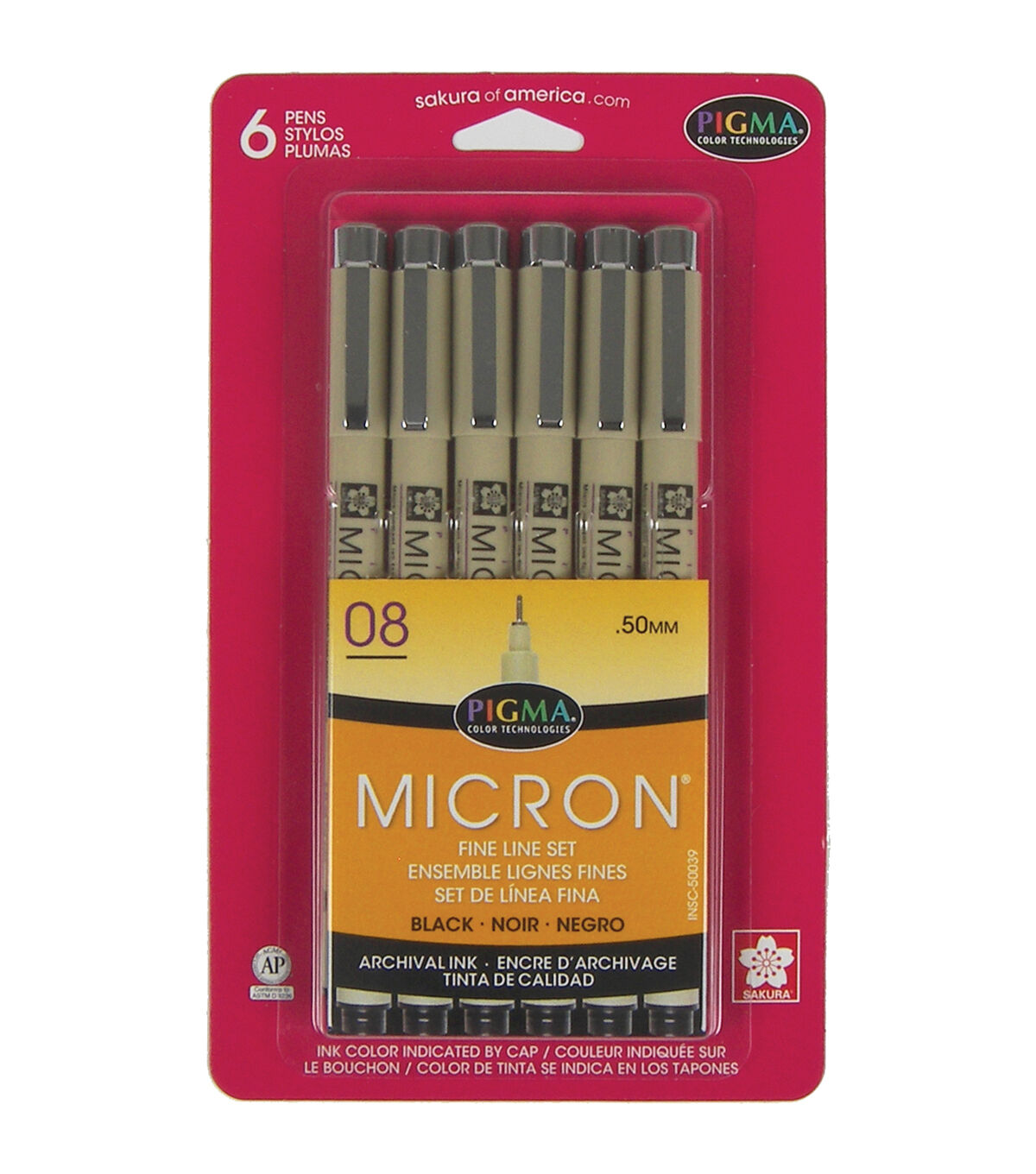 Sakura-Pigma Micron Pens 08 .5mm: Black. Archival quality ink is waterproof, chemical resistant, fade resistant, bleed free, quick drying and pH neutral. Ideal for sketching, inking, illustration and Zentangle. This package contains six 08 black micron pens with fine line tips. Conforms to ASTM D 4236. Imported.