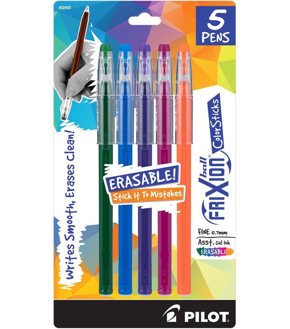 Pilot Pen-FriXion Ball Color Sticks Erasable Gel Pens: Black, Blue, Purple, Magenta And Salmon. These pens allow you to erase and rewrite repeatedly without damaging documents. The thermo-sensitive gel ink formula disappears with the erasing friction of a rubber tail plug eraser on the pen. This package contains five 5-3/4 inch long 0.7mm erasable gel pens in assorted colors. Imported.