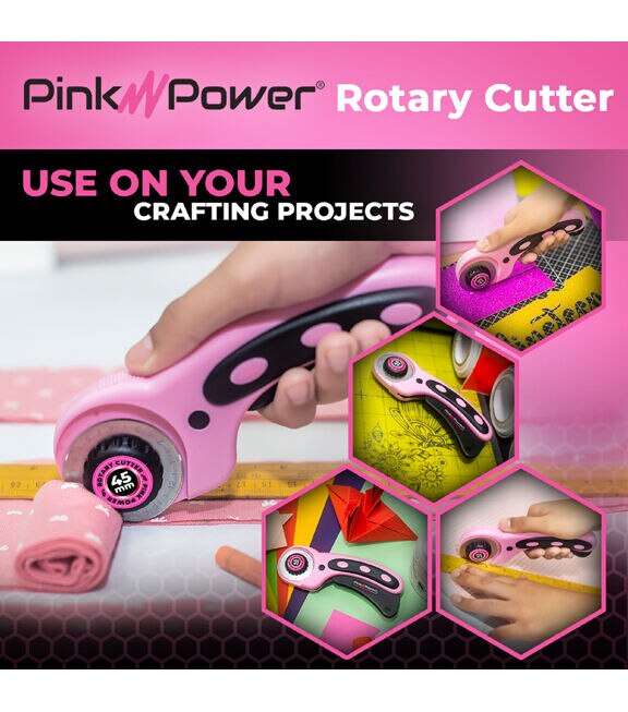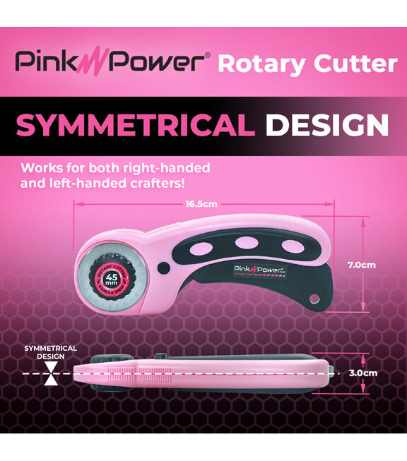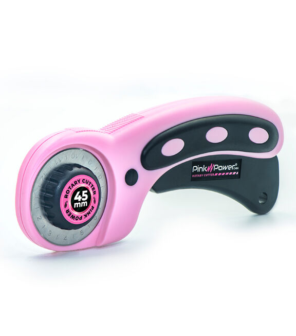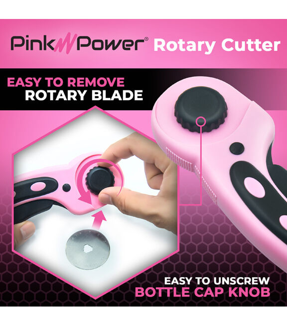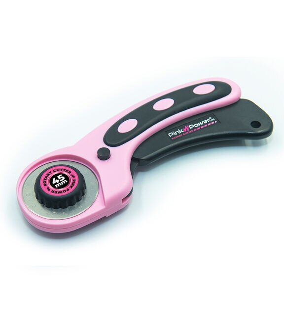 Pink Power Manual Rotary Cutter with a 45 mm blade offers precise cuts through thick quilting materials and multiple layers of fabric. It has an updated blade and handle that makes every job even easier. This fabric cutter has a symmetrical design that works for left- and right-handed crafters. The ergonomic design – curved, loop-handle – provides a natural fit for your hand that improves control and comfort. It has an easy-to-unscrew bottle cap knob that makes the rotary blade easy to remove and a squeeze trigger retracting the blade, disengaging, and locking it into a safe position for safe storage. This rotary cutter is an excellent tool, making the chore of cutting faster and more exact.