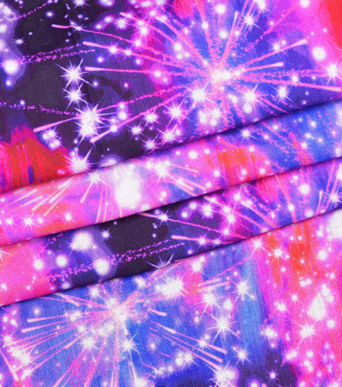 Add some sparkle to your next project with this stunning cotton fabric featuring a vibrant pink and blue fireworks design against a dark night sky background. Perfect for creating festive decorations, apparel, and accessories for all your patriotic events.
