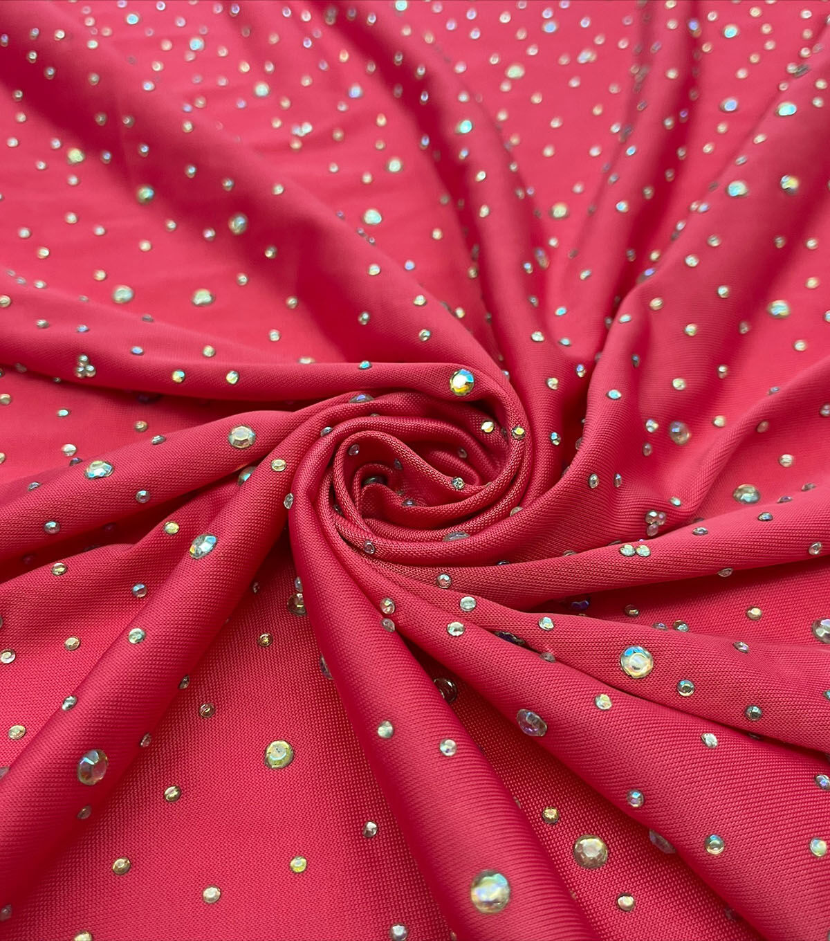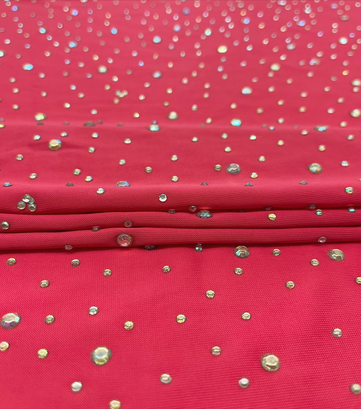 Add some glamour to your wardrobe with our Pink Rhinestone Stretch Jersey Knit Fabric. The fabric features a beautiful pink color and is adorned with rhinestones that add a touch of sparkle and shine to any outfit. The stretchy jersey knit material is comfortable to wear and perfect for creating a variety of garments.