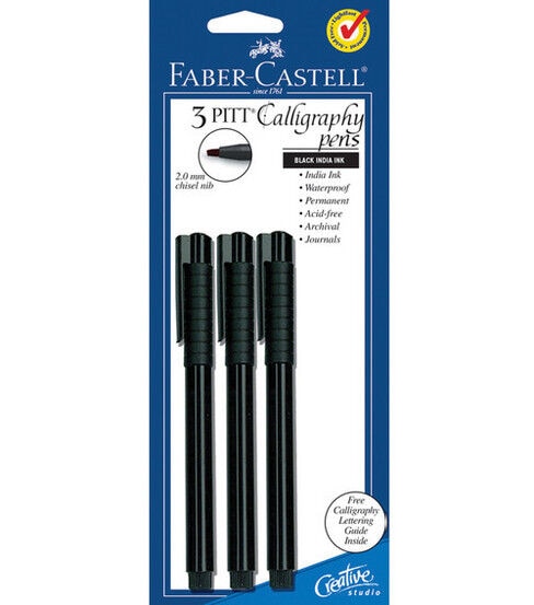 Three black calligraphy pens made of India ink, waterproof, permanent, acid free, archival, and smudgeproof. Comes with a 2.0mm chisel nib.Perfect for calligraphy and journaling. Each pen is individually rated for light fastness.