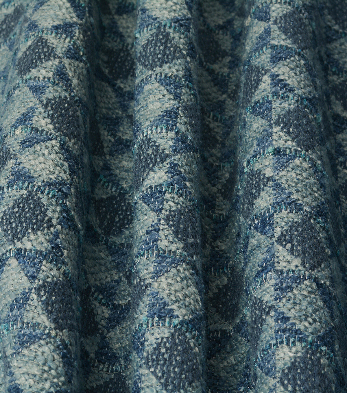 An intricately woven checkerboard pattern with alternating novelty yarns, slubbed textures, and a playful mix of beads that form a dynamic diamond parquet. The dying process results in a captivating gradation of colors, infusing the fabric with a rich tonality that perfectly captures the exuberant palette of vibrant and playful colorways.