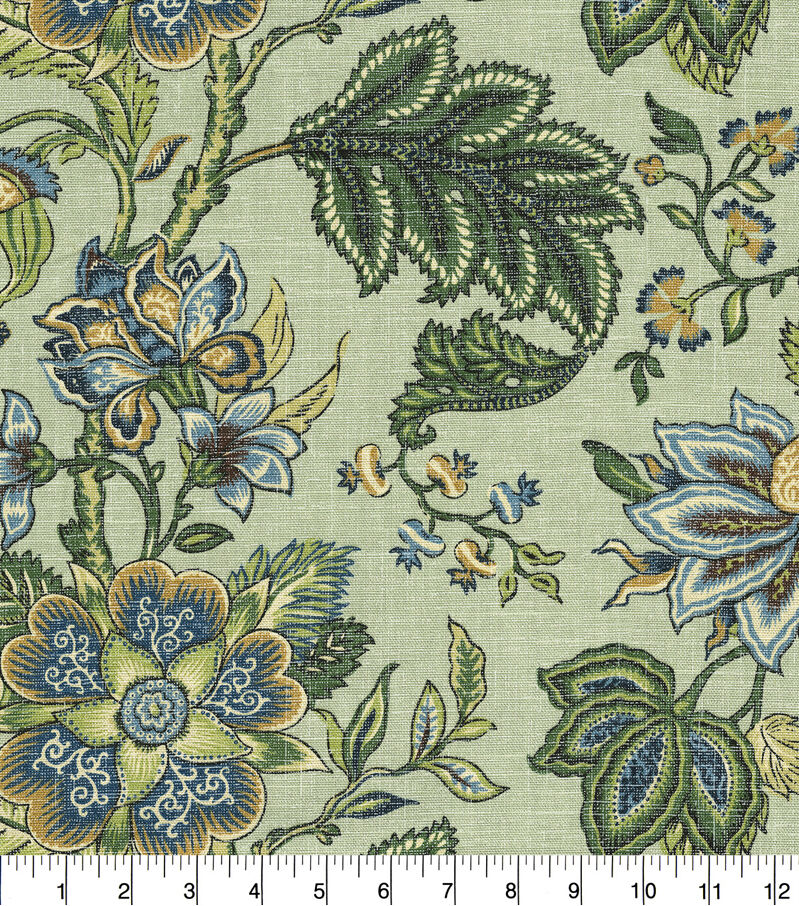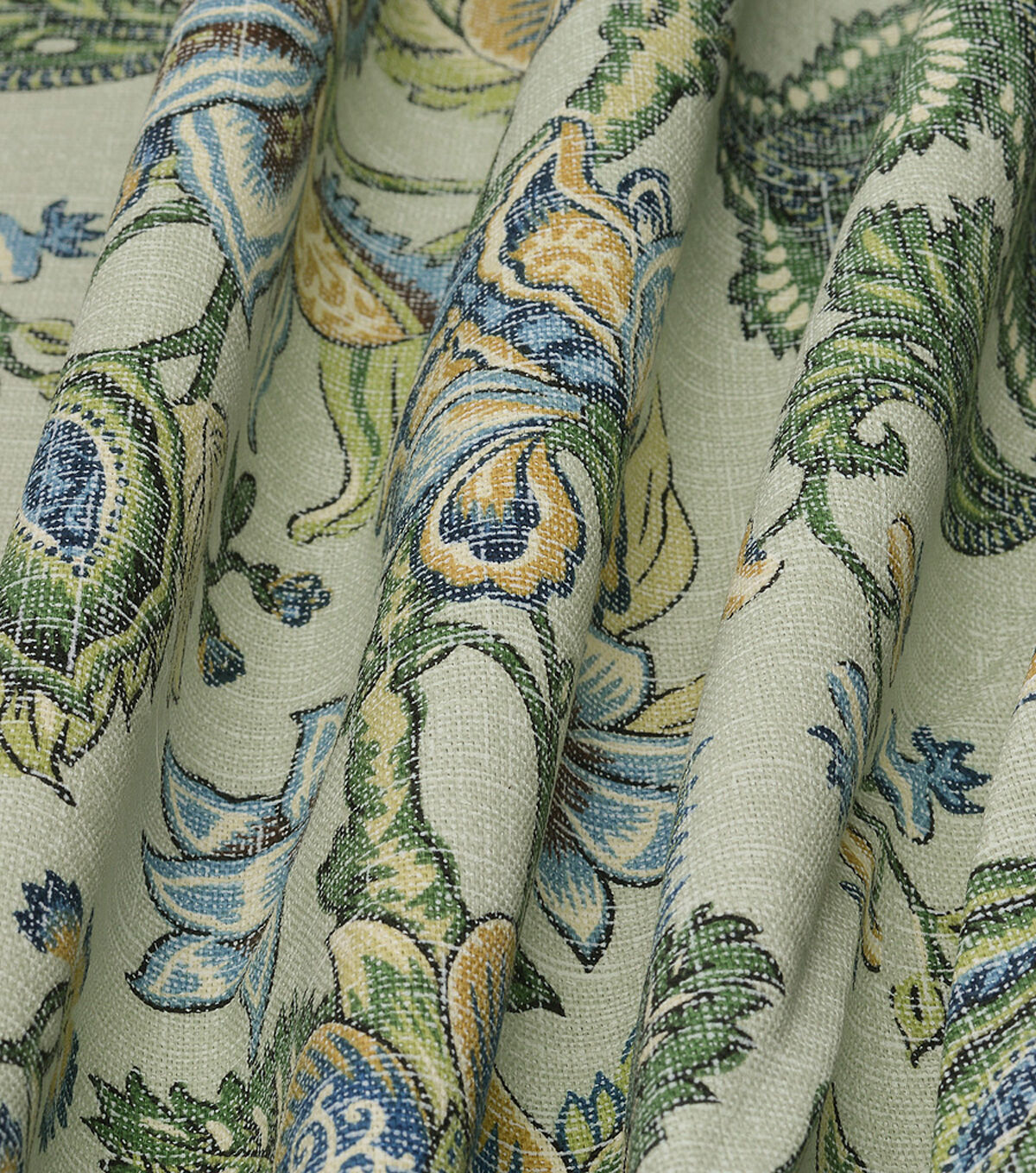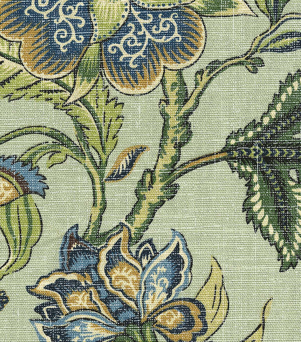 Lighter traditional, and mid-scale, this decorative floral teems with rich color and Jacobean flair. A linen texture, printed over, creates a supply hand with an abundance of dimension.