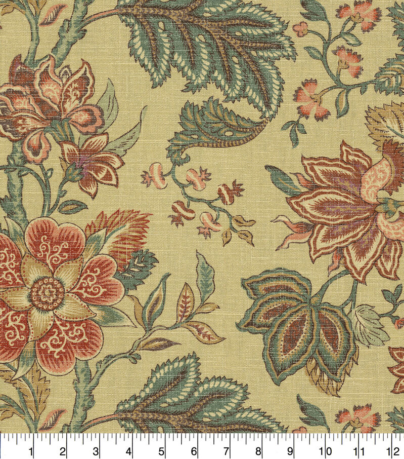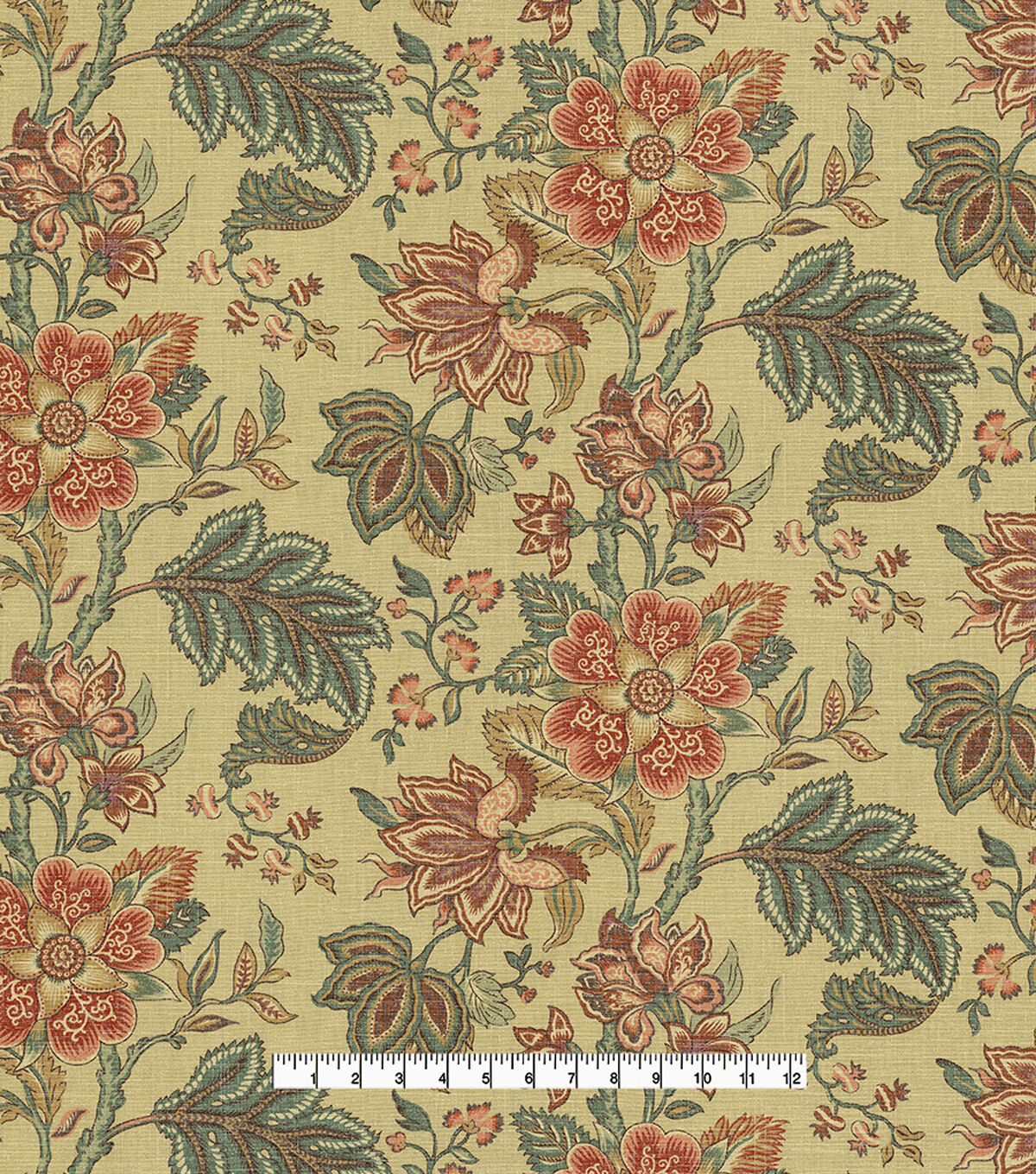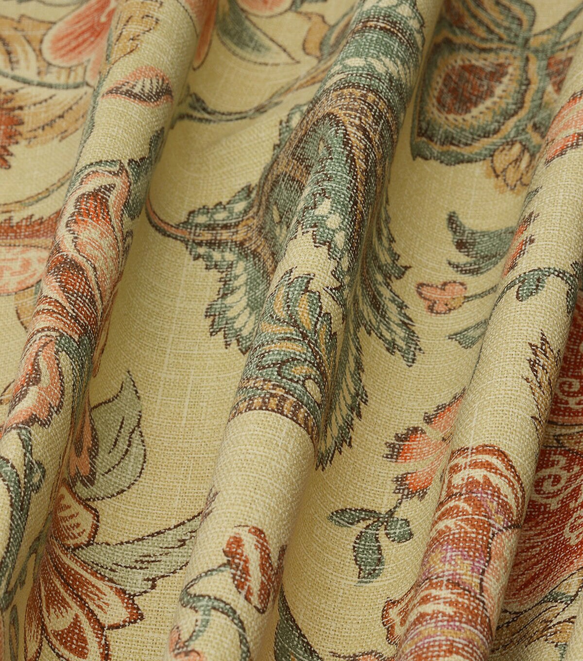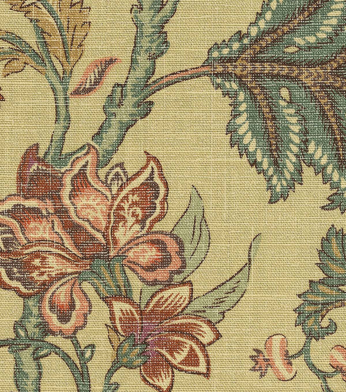 Lighter traditional, and mid-scale, this decorative floral teems with rich color and Jacobean flair. A linen texture, printed over, creates a supply hand with an abundance of dimension.