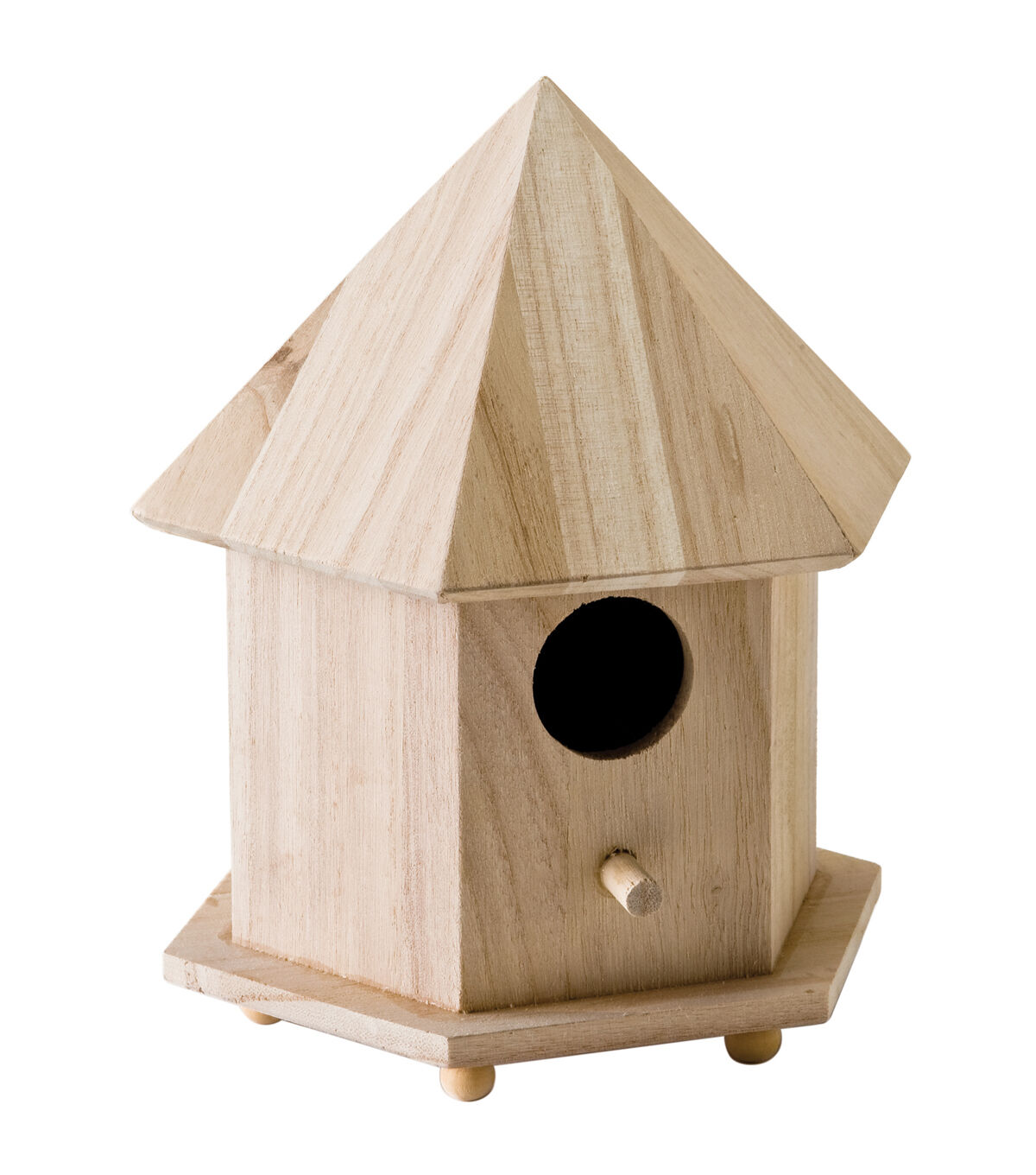 Use unfinished wooden accents such as the Plaid Wooden Gazebo Birdhouse to create customized home decor accents. It can be painted, stained, inked or decorated with paper or fabric to match your personal style. Let your creativity and imagination be your guide. This pack contains one unfinished wooden birdhouse in a hexagonal shape and is designed with a single opening and a perch. Embellishments are not included.