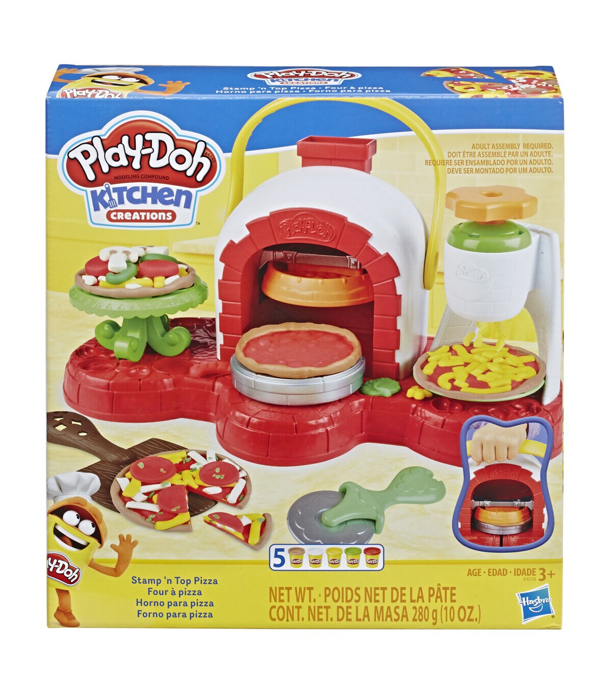 - Includes unassembled oven playset, cheese presser, pizza paddle, plate, roller, pizza cutter, 3 creation cards, and 5 cans of Play-Doh Brand Modeling Compound (net weight 10 ounces).