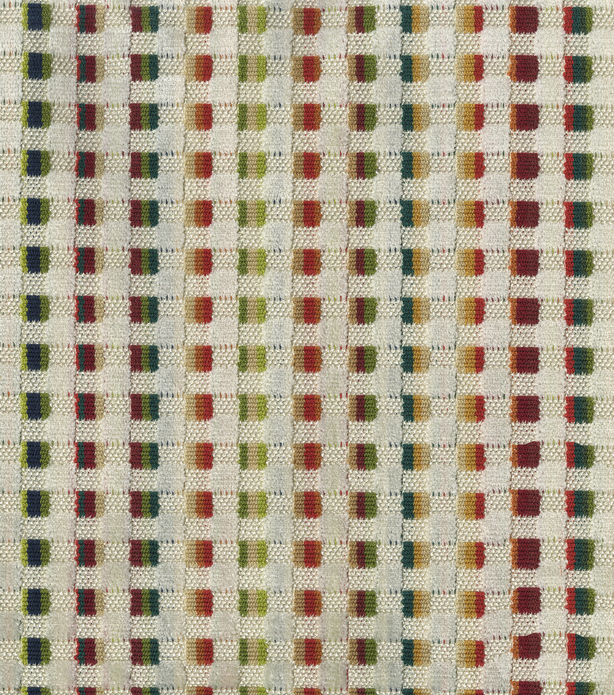 A cut pile velvet in a small scale block pattern. The mix of ivory with blues and greens in varying intensities make this fabric perfect for tying any room setting together.