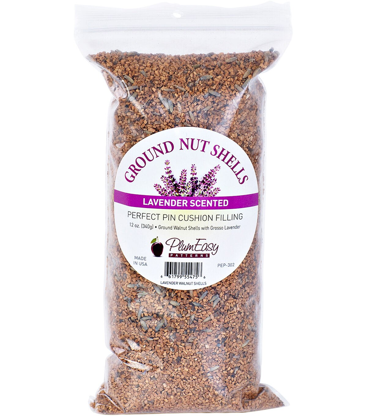 The PlumEasy Patterns Lavender Scented Ground Walnut Shells are an ideal filling for pincushions. These lavender-scented ground walnut shells are strong and hefty and will keep the pincushion stable. You can also use these shells for filling neck rolls or massage rolls. This pack contains 11.5 ounces of ground walnut shells.