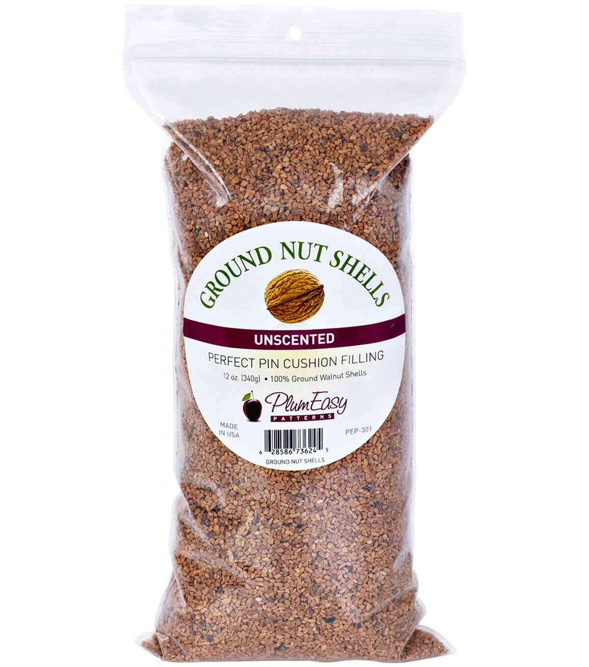 Ground walnut shells are an ideal filling for pin cushions. The filling is strong and hefty, and when used in a pin cushion, keeps it stable. Good for filling neck rolls or massage rolls that can be microwaved. This package contains 11.5oz of ground walnut shells. Made in USA.
