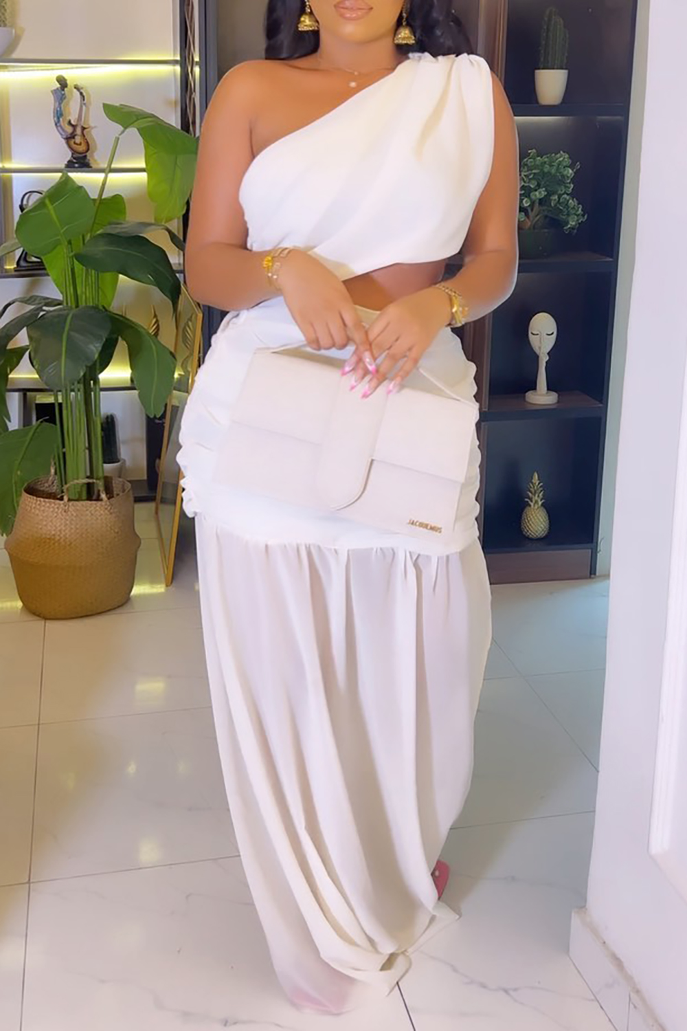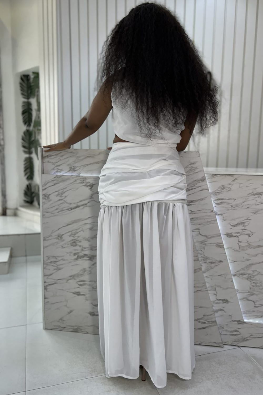 • Plus Size Beach White Oblique Collar Hollow Split Chiffon Maxi Dresses