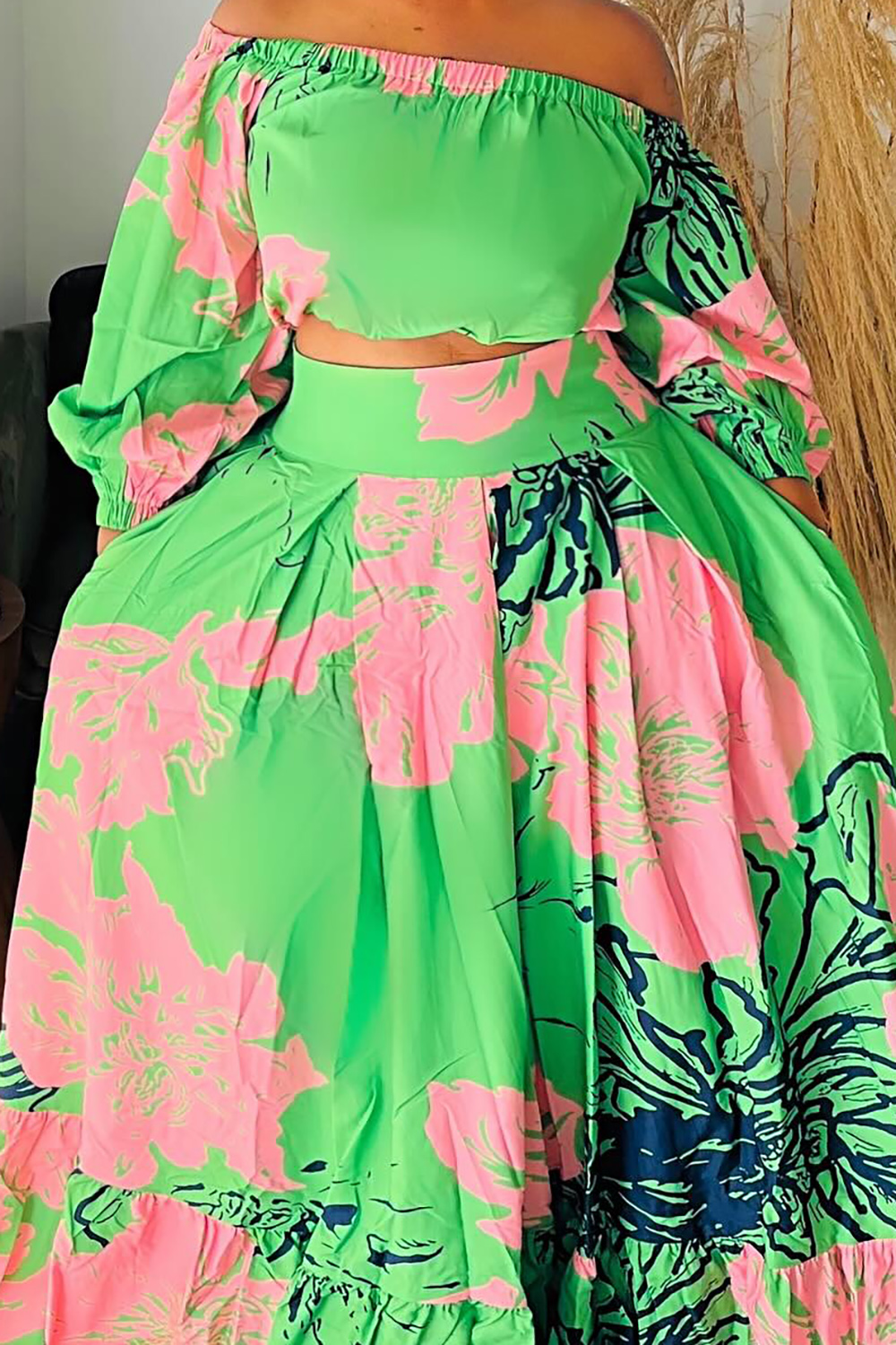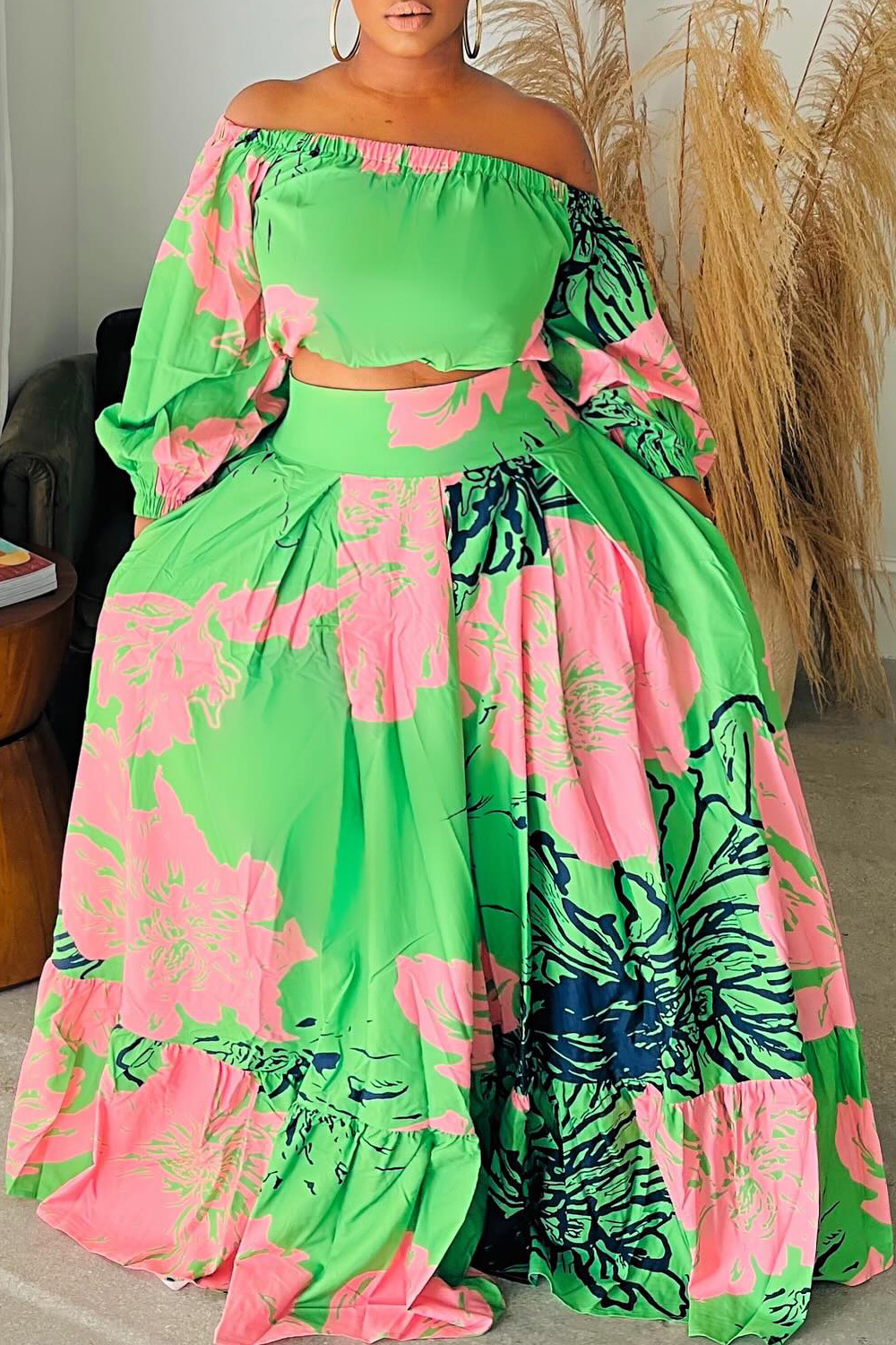 Plus Size Vacation Green Graphic Off The Shoulder Sundress 3/4 Sleeve Two Piece Skirt Sets