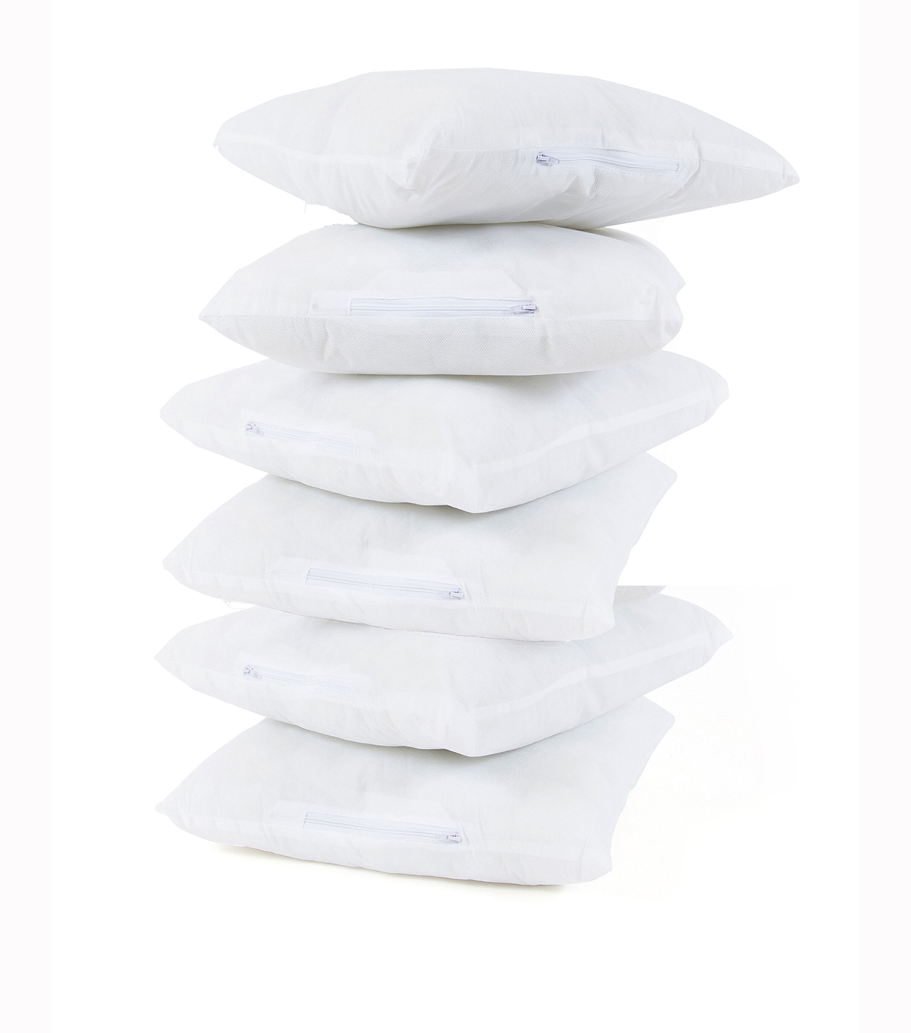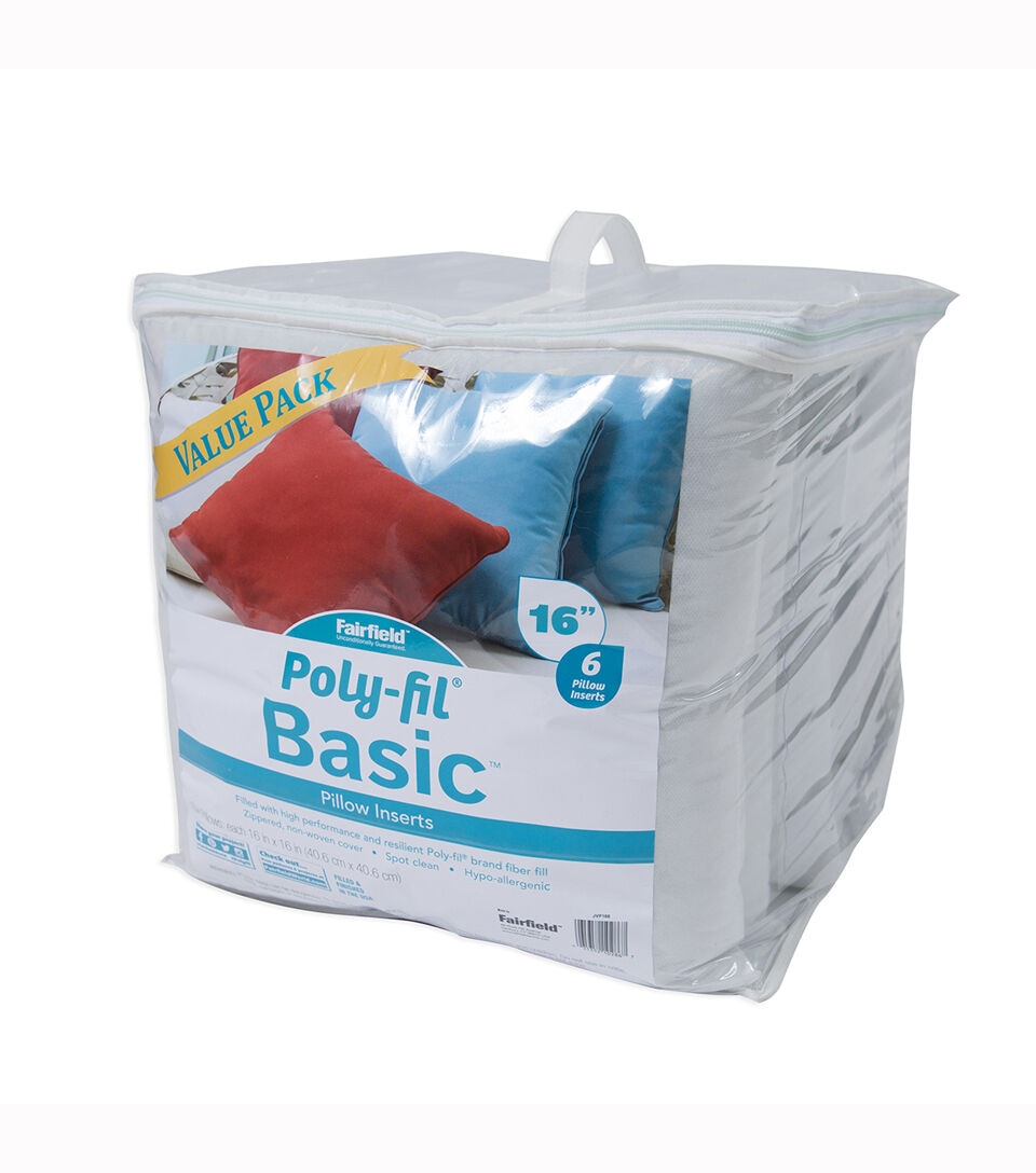 Poly-Fil Basic six pack pillow inserts are perfect when you want to do some DIY or craft projects with your friends or family. They also make a great creative activity at school or camp. Personalize them with fabric, faux fur, needlepoint, or a monogram, to add a special touch to your favorite spaces or give as gifts for those close to your heart. They are a quick, easy, and an inexpensive way to change and refresh the look of a room in your house or use as holiday and seasonal décor. The firm texture allows them to retain their shape when working with the heavier upholstery fabrics or heirloom pieces. Poly-Fil Basic pillow forms are made of 100% polyester fibers with no added chemicals or flame retardants and have a non-woven polypropylene cover. Poly-Fil Basic 16in x 16in two pack pillow inserts are great as decorative and throw pillows. For the perfect fit your pillow cover should be an inch shorter than the pillow size.